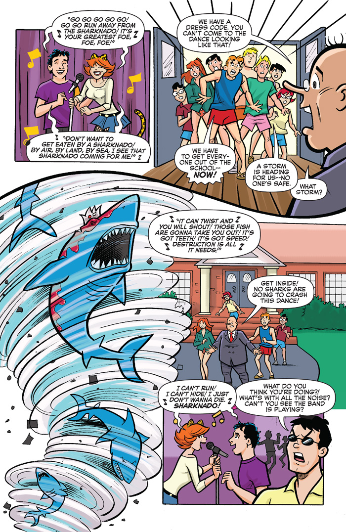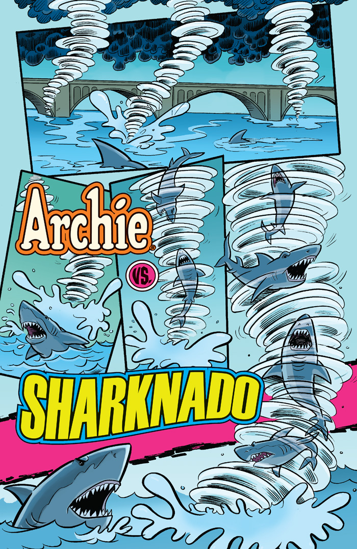 It’s that time of year in Riverdale! The end of the school year. Time for beaches, barbecues, fun in the sun and… SHARKNADOS!?! That’s right, get ready as Archie and the gang brave the storm of a tornado full a sharks that riffs off the pop culture phenomenon known as Sharknado! The story unfolds as sharknados are spotted on the “Feast” Coast! Our heroines have to figure out how to get back to Riverdale, where the storm is about to hit next. Soon Archie and the gang go, go, go as they battle the Sharknado-ravaged Riverdale! Who will live? Who will die? Will this take a BITE out of the end-of-the-year prom? Uh….probably!