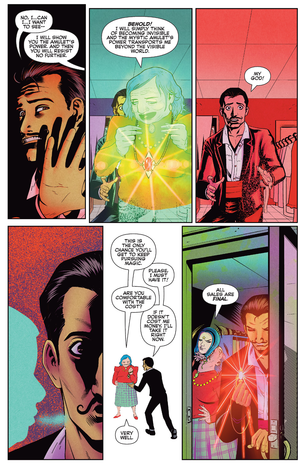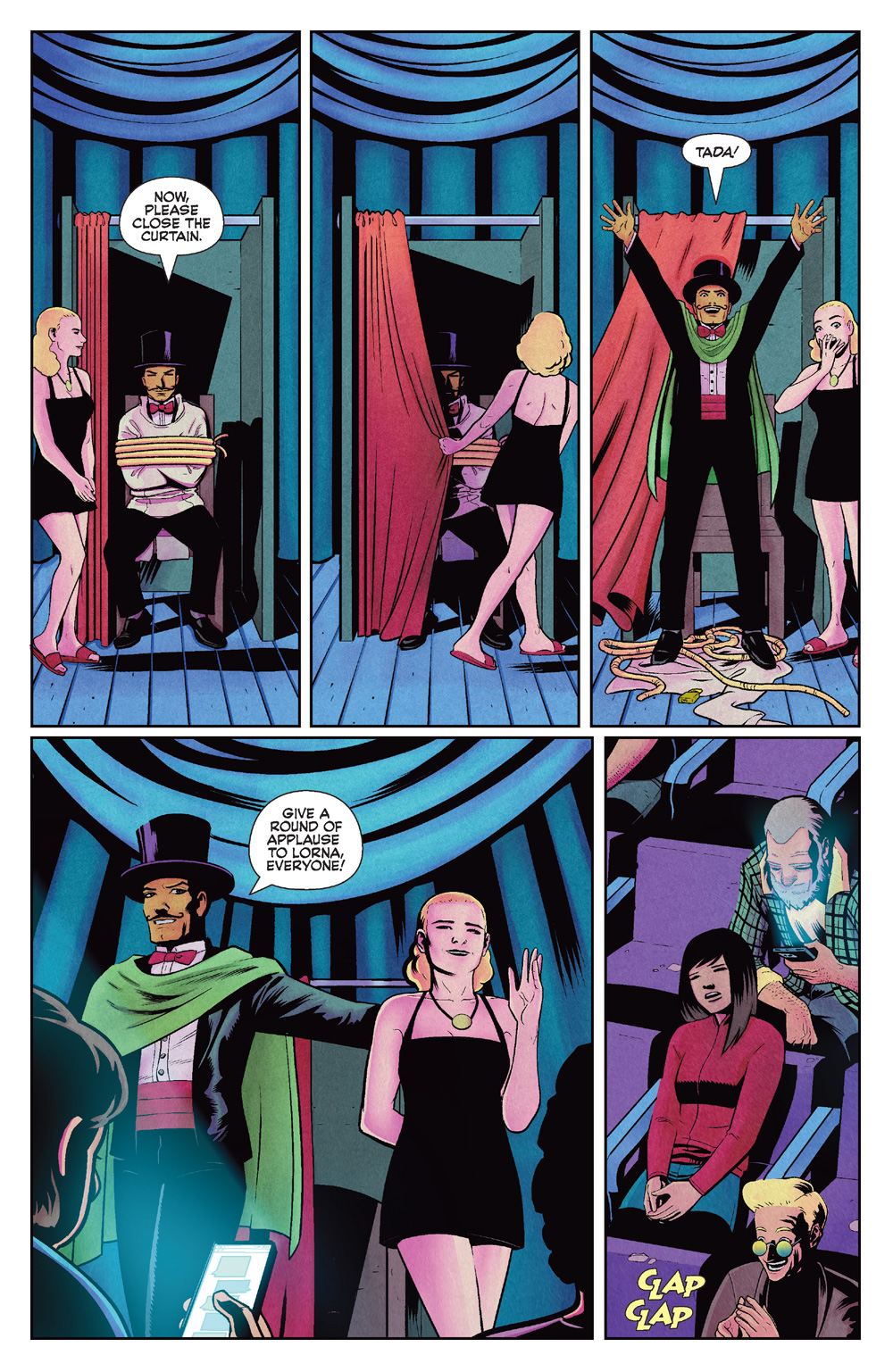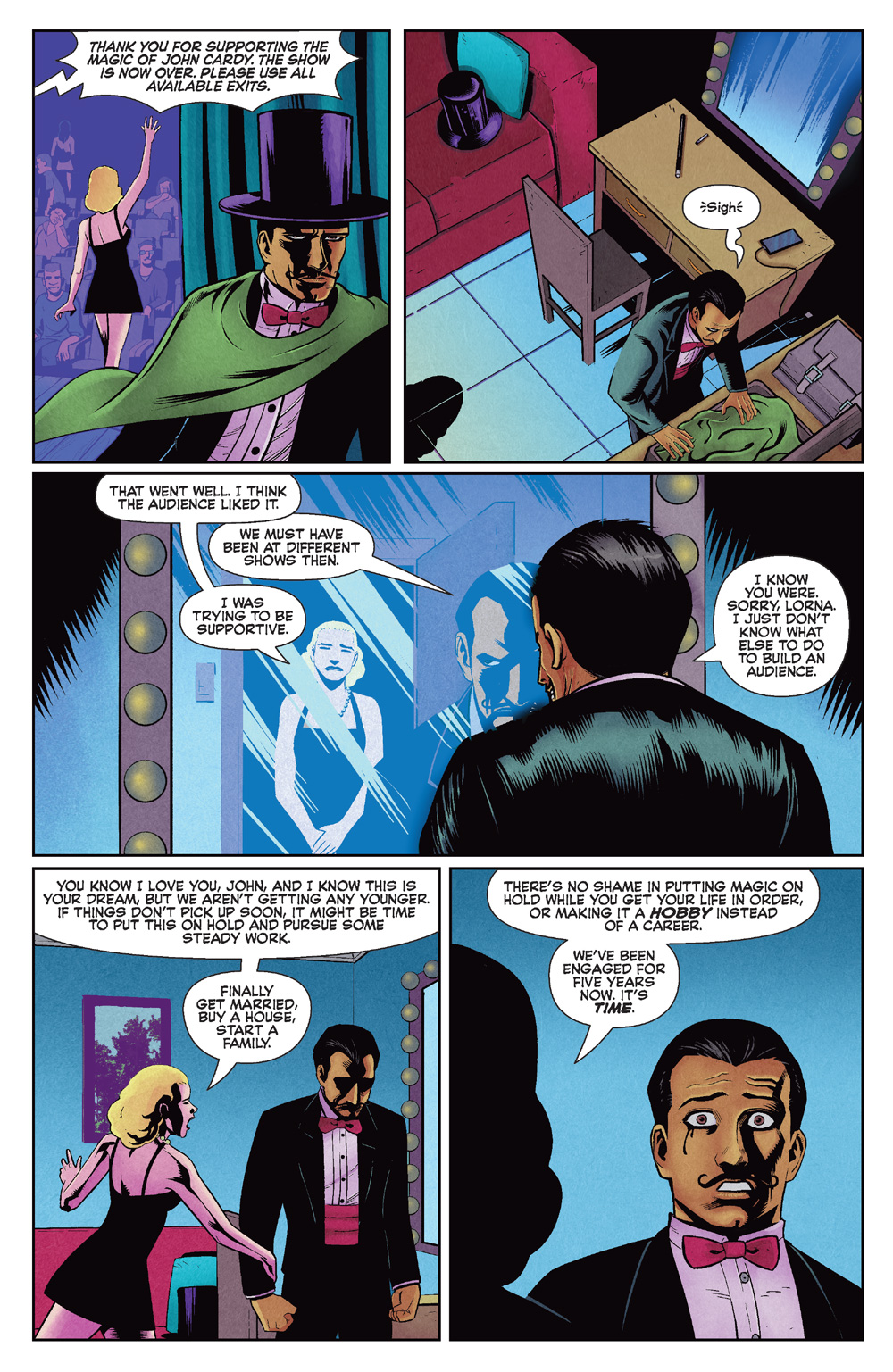 Speaking of Butch, we especially wanted to know how he handled some of the creepier aspects of Joe’s script! “The most important thing to do in the beginning of any comic is to establish the characters and their world and to set the tone for the rest of the story,” he said. “For KARDAK THE MYSTIC, Joe came up with a tale that was less about jumpscares and more about a creeping sense of dread. Visually, I wanted to make strong use of blacked out areas to give a heavier weight to each page. The presence of spotlights in a stage environment helped greatly in this. Ellie Wright did a masterful job filling the world with color in a way that enhanced the artwork. The narrative itself has a strong element of the hidden and unseen, so being able to obscure things through shadow was a natural fit.”