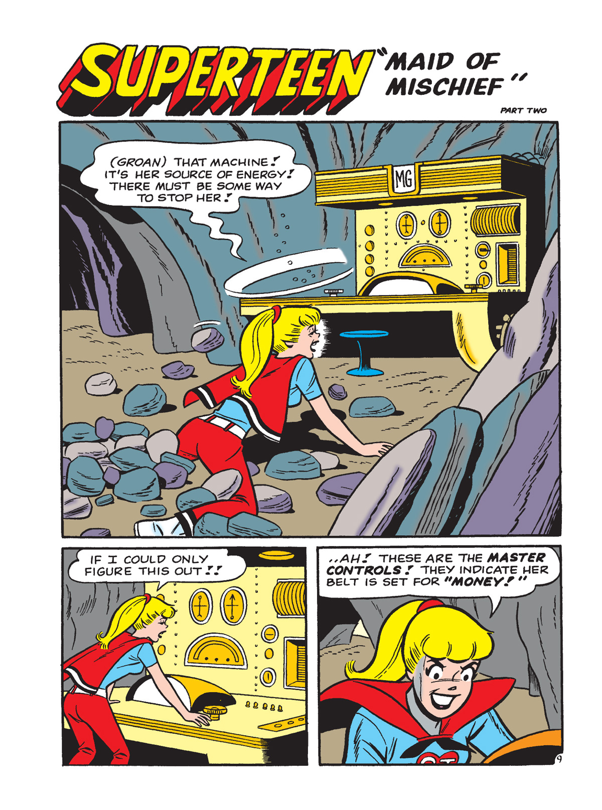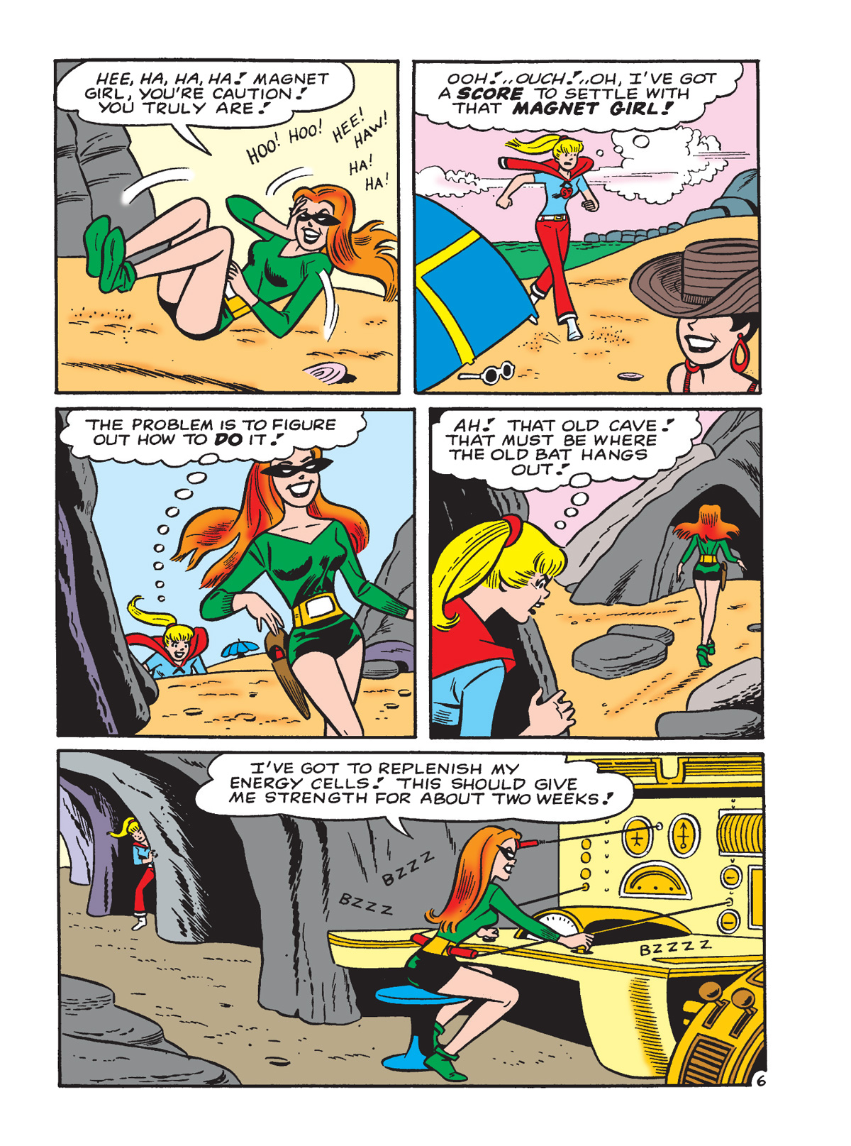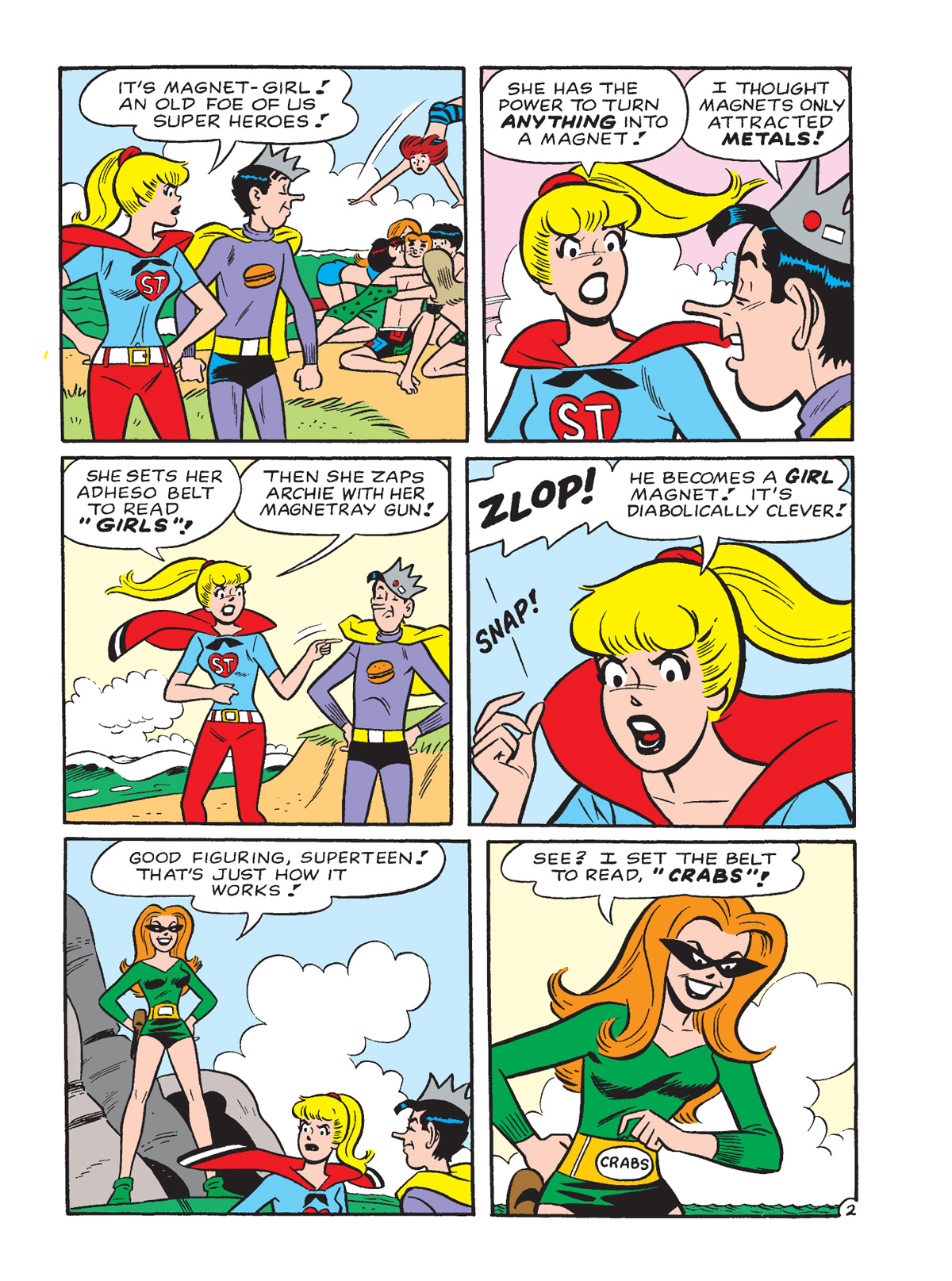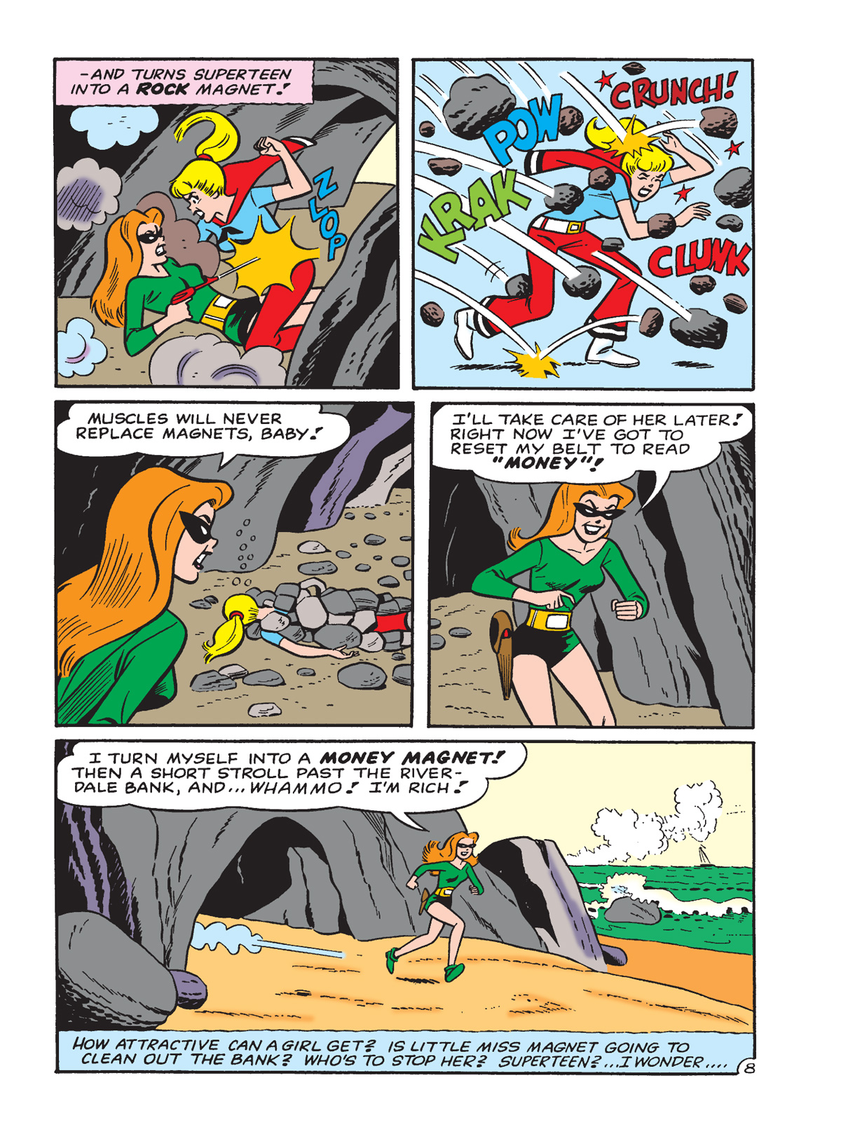 In the latest volume, we get a wild assortment of classic Archie hijinks from across the decades including recent holiday hits and all-timers from the archives. One of those, which you can read in full below, is an epic two-parter by Archie Legends Frank Doyle and Dan DeCarlo starring Betty Cooper as the heroic SuperTeen, doing battle with the villainous Magnet Girl. Good old MG can make anyone attract anything she chooses, like a magnet, and that’s especially messy when she sets her sights on things like mustard from the hot dog cart at the beach.