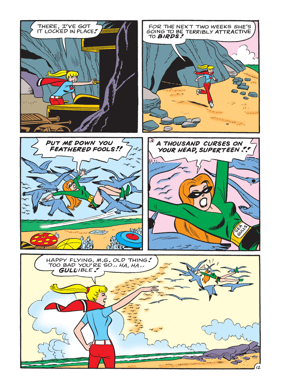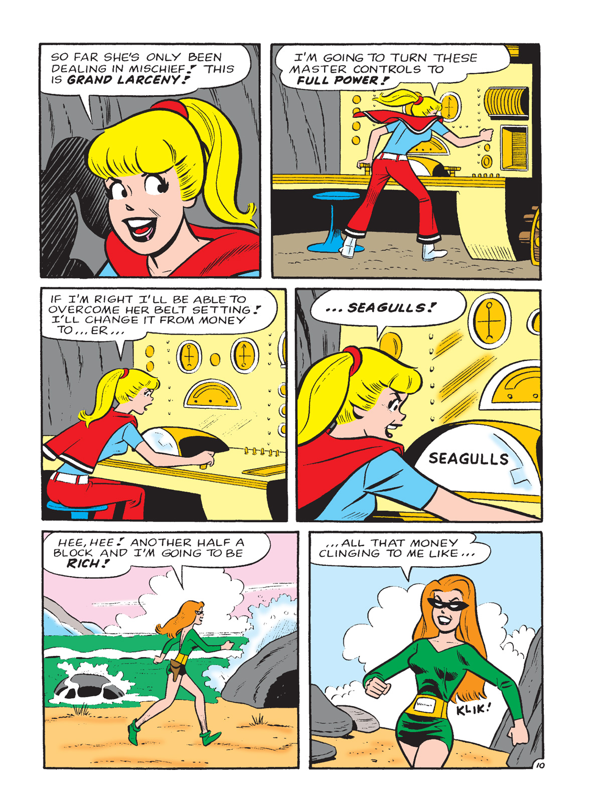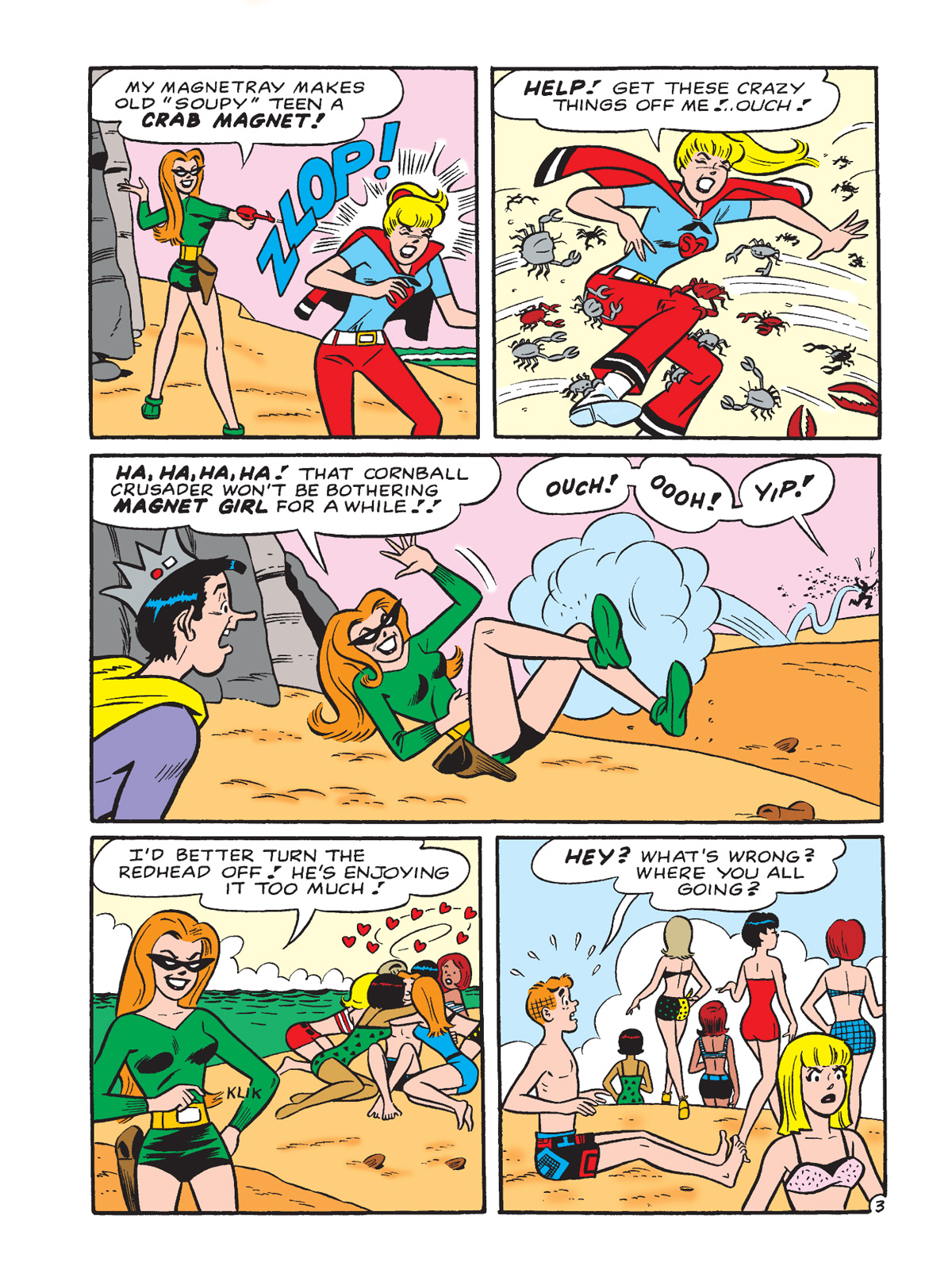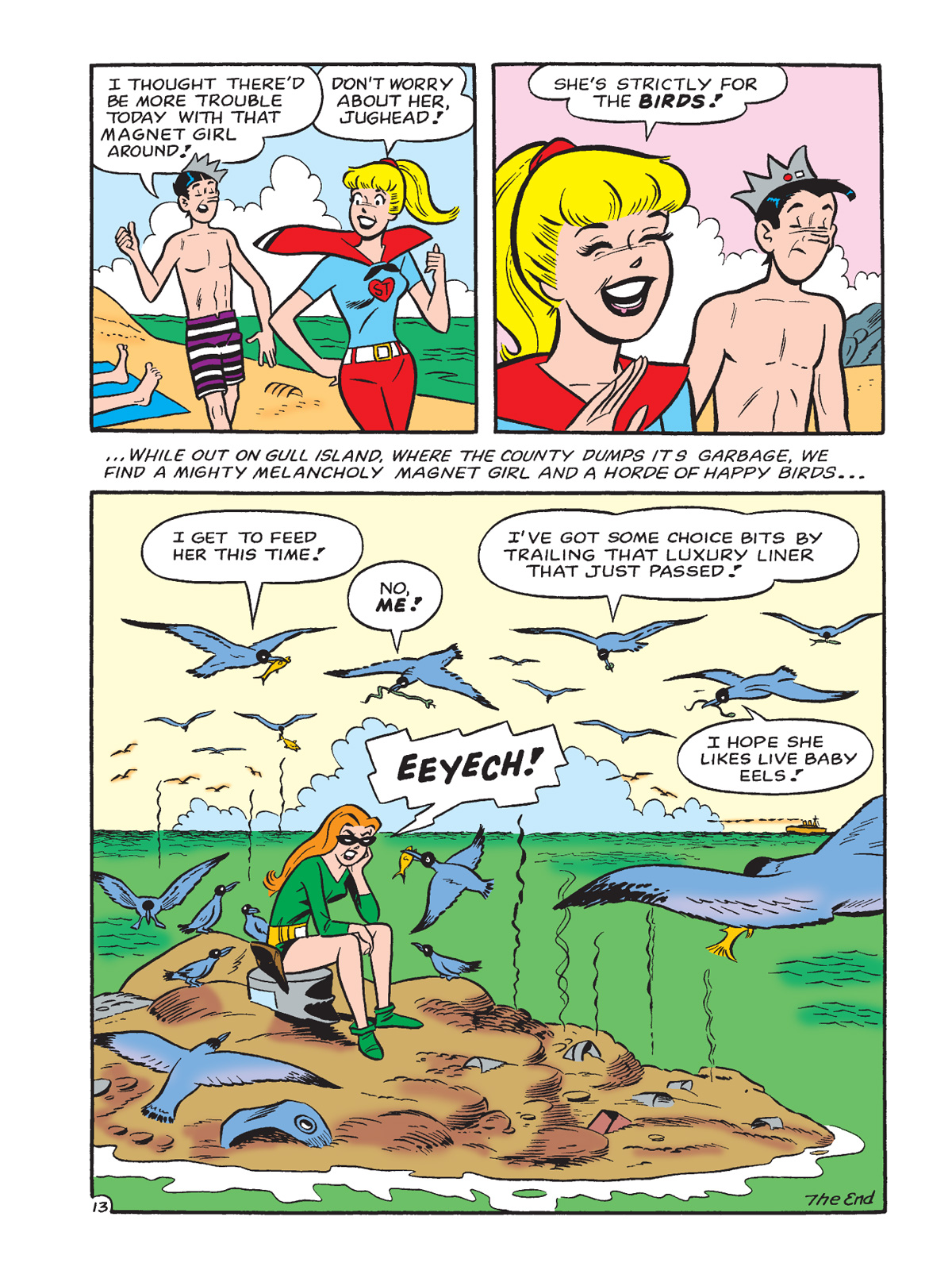 In the latest volume, we get a wild assortment of classic Archie hijinks from across the decades including recent holiday hits and all-timers from the archives. One of those, which you can read in full below, is an epic two-parter by Archie Legends Frank Doyle and Dan DeCarlo starring Betty Cooper as the heroic SuperTeen, doing battle with the villainous Magnet Girl. Good old MG can make anyone attract anything she chooses, like a magnet, and that’s especially messy when she sets her sights on things like mustard from the hot dog cart at the beach.