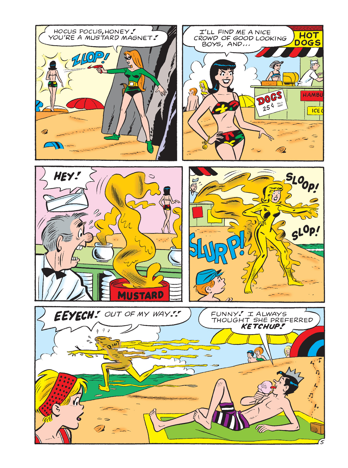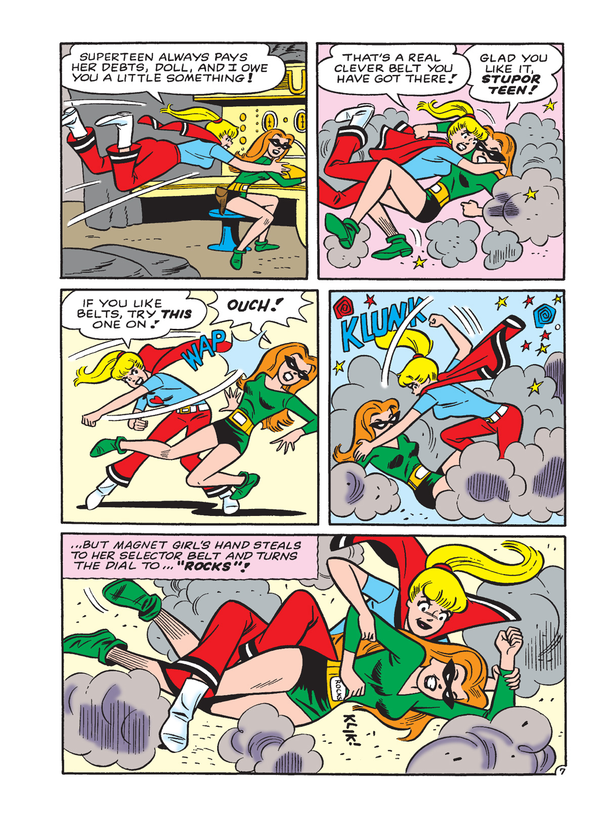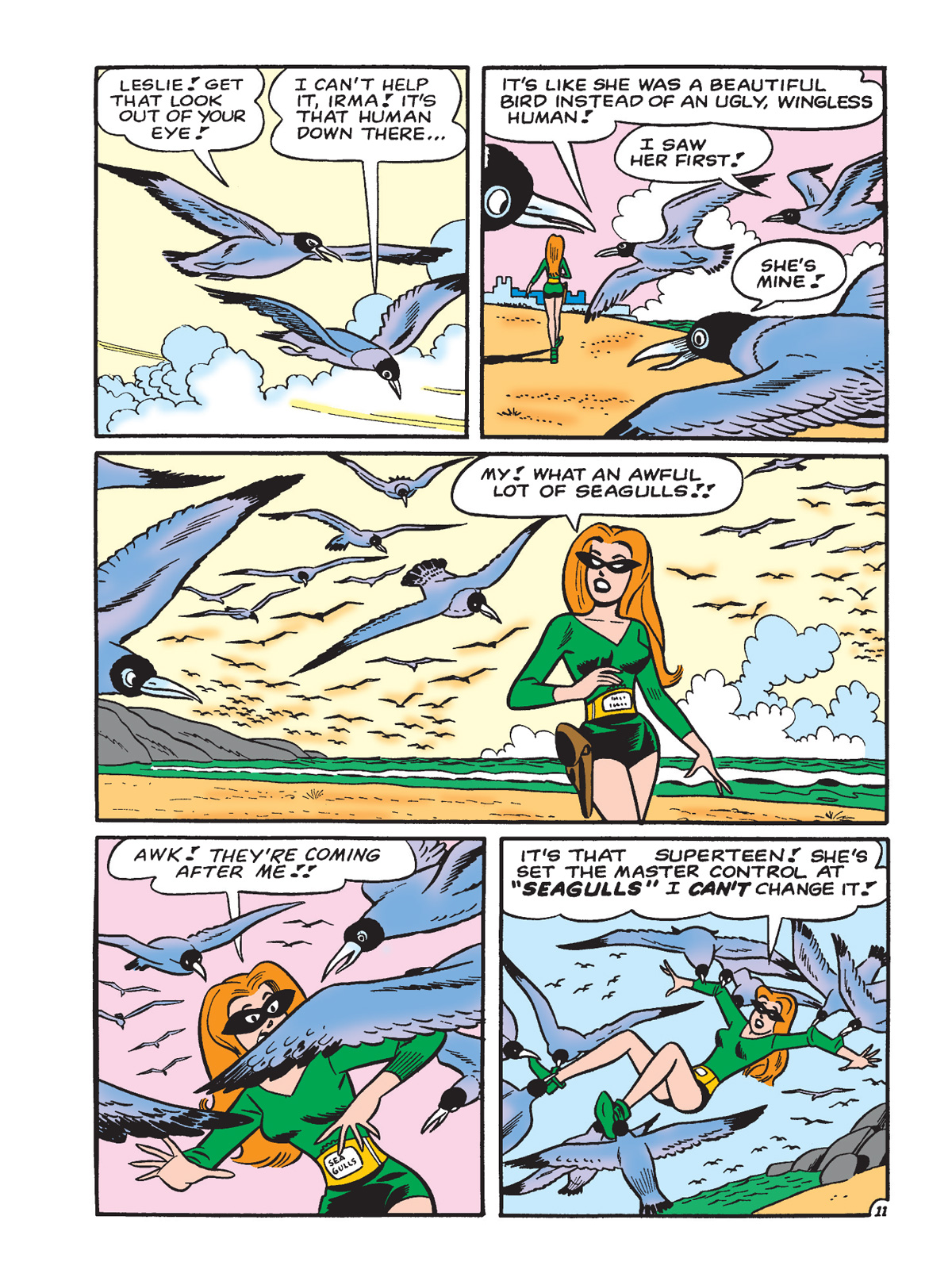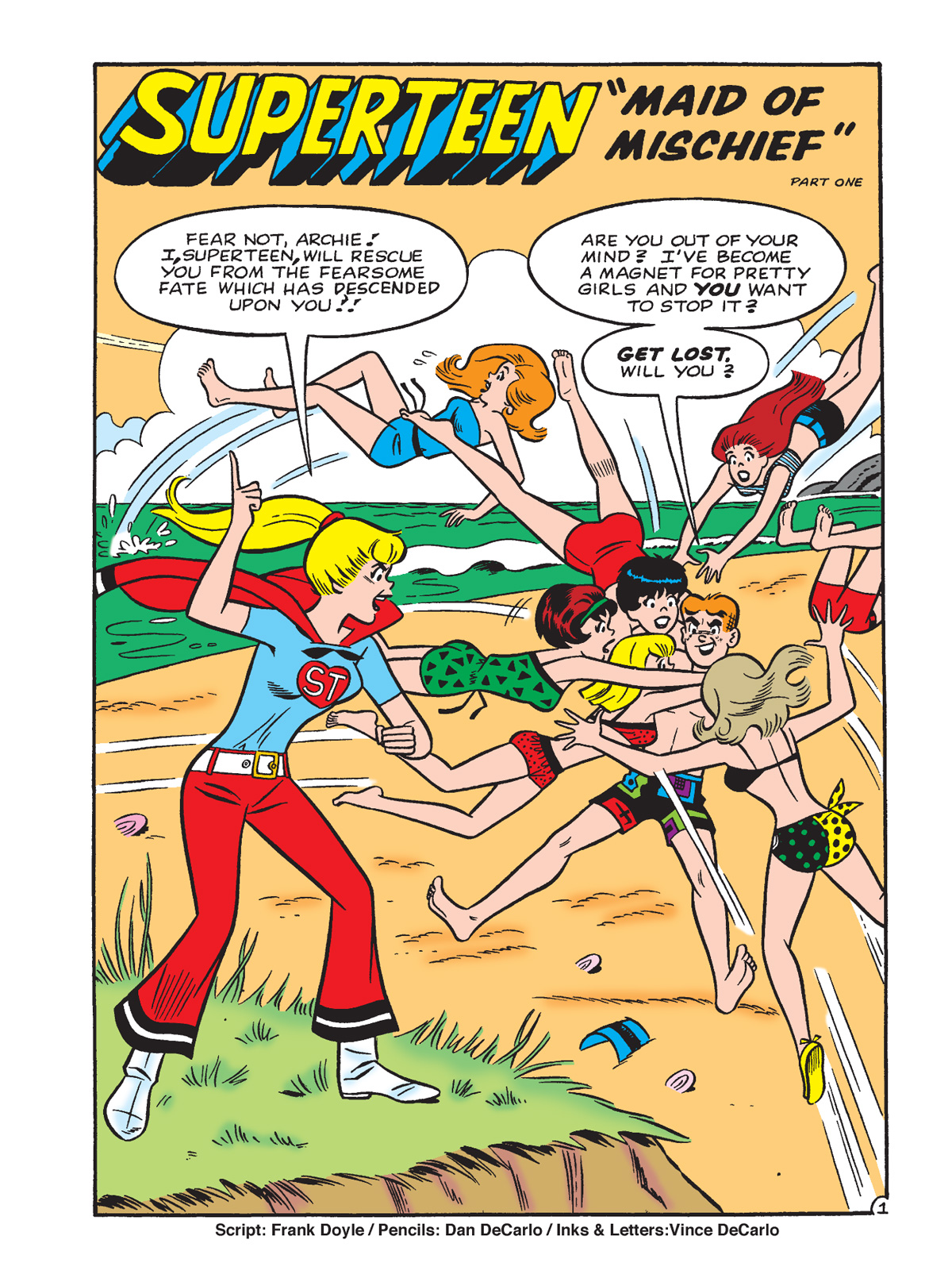 In the latest volume, we get a wild assortment of classic Archie hijinks from across the decades including recent holiday hits and all-timers from the archives. One of those, which you can read in full below, is an epic two-parter by Archie Legends Frank Doyle and Dan DeCarlo starring Betty Cooper as the heroic SuperTeen, doing battle with the villainous Magnet Girl. Good old MG can make anyone attract anything she chooses, like a magnet, and that’s especially messy when she sets her sights on things like mustard from the hot dog cart at the beach.