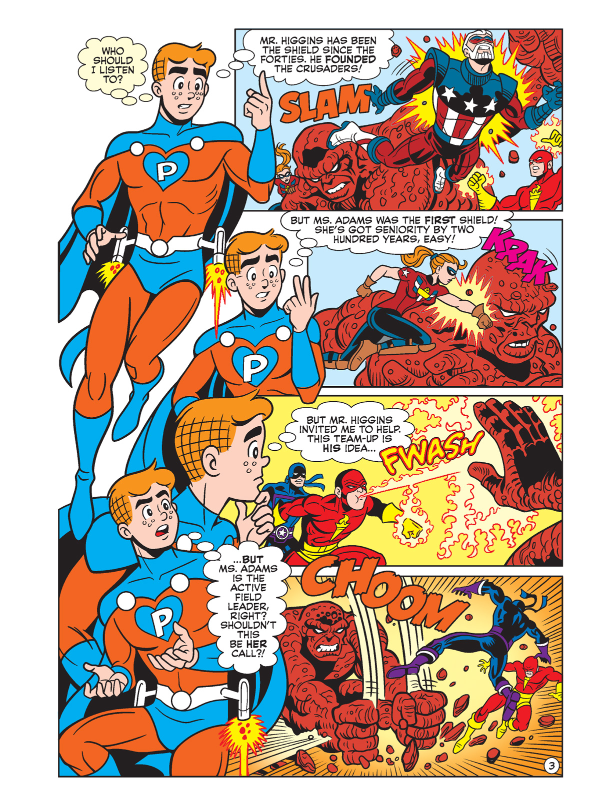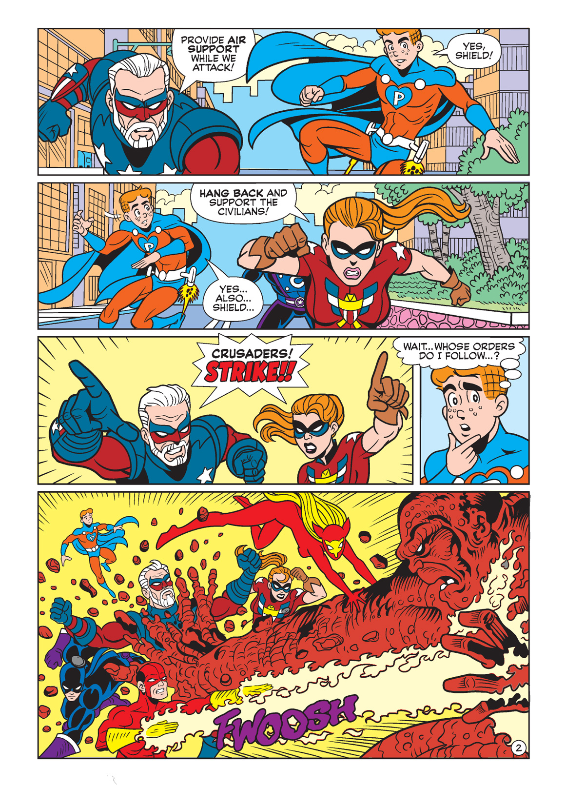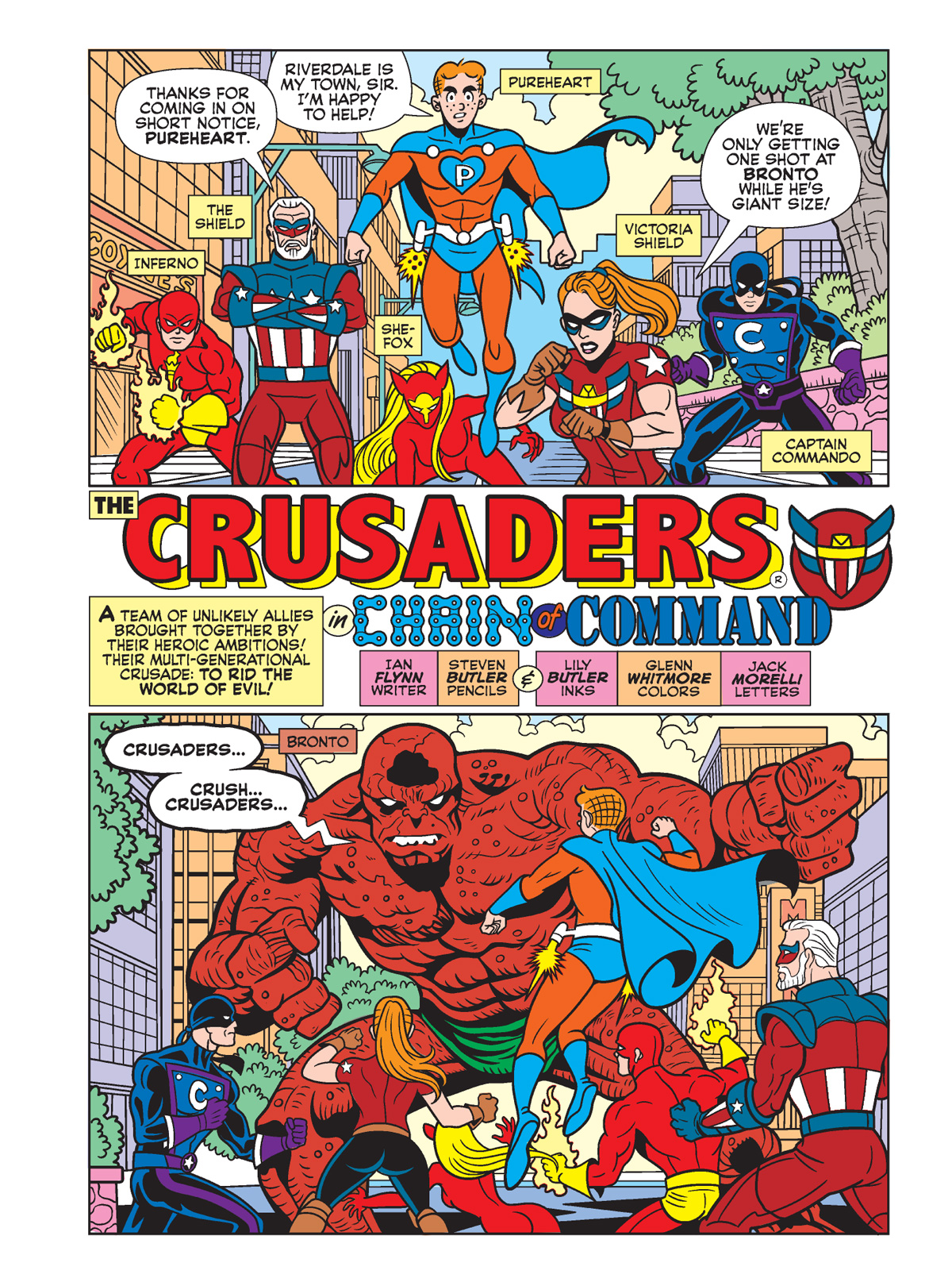 Leading off this action-packed, pocket-sized fun fest is “Chain of Command,” a full Crusaders team-up by writer Ian Flynn and artist Steven Butler! Pureheart (a.k.a Archie Andrews) is here, as well, and he’s having trouble figuring out which Shield he should answer to. Relatable!