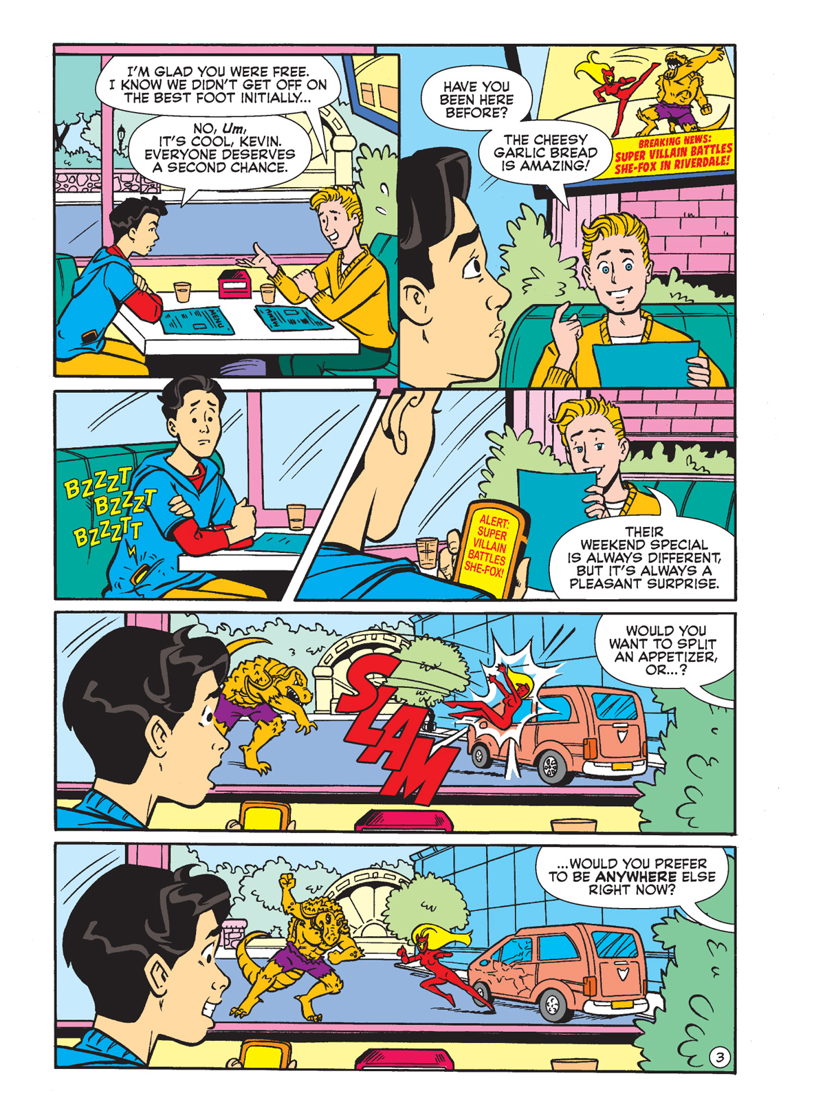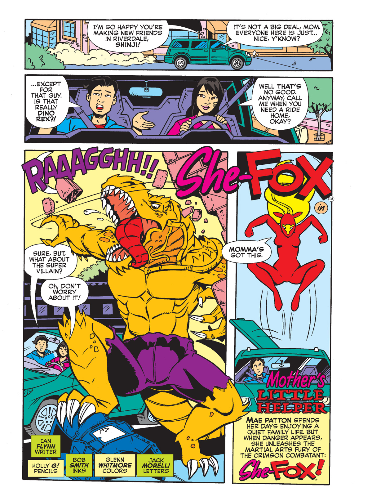 Next is a She-Fox solo caper by Ian and artist Holly G!, but she’s not completely by herself. Her son Shinji (a.k.a. Ghost Fox) is out with Kevin Keller (following their meet-cute in last month’s BETTY & VERONICA DIGEST #312), and they will surely be roped into the shenanigans.