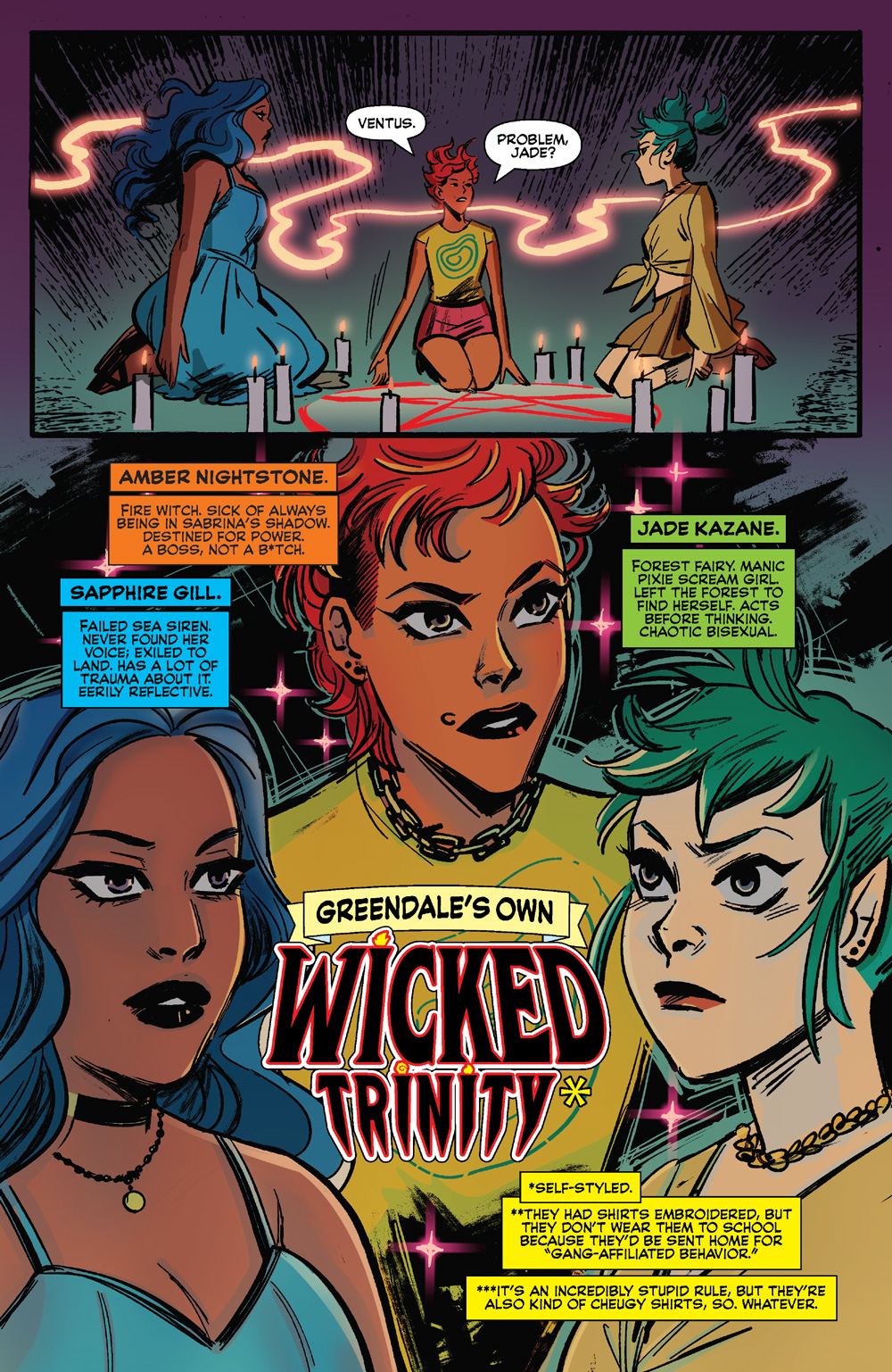 Wicked Trinity Comic Cover AYou first met the Wicked Trinity in the pages of SABRINA ANNIVERSARY SPECTACULAR and last year’s SABRINA ANNUAL SPECTACULAR, well guess what? They’re back and badder than ever in a one-shot for older readers, and their magical prowess has earned them their very own comic away from Sabrina’s meddling. In the new story by Sam Maggs and Lisa Sterle, the trio has formed a coven at Greendale High but all is not well as they don’t see completely eye to eye. A magical maelstrom is brewing, and you’ve got a front row seat when you grab your own copy here, but sneak a peek at the issue below first!