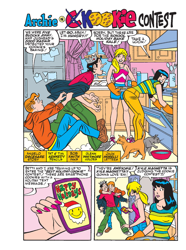 BRAND NEW LEAD STORY: “Kookie Contest” When Betty and Veronica bake up some yummy cookies for the school holiday bake contest, will they win first prize or will Jughead treat himself to them all?