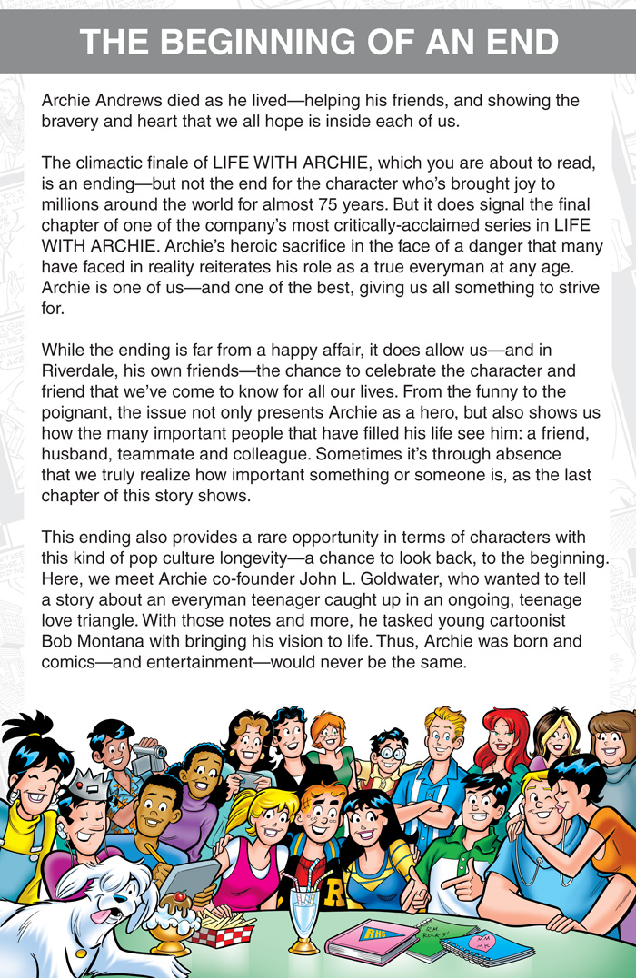 It’s the comic book event of the century—the death of Archie Andrews! Read the story the entire world is discussing in this heart-wrenching finale to the MARRIED LIFE graphic novel series, as Archie Andrews–-America’s most beloved character-–sacrifices his life heroically while saving the life of a close friend. Bringing to a close the acclaimed storyline that revealed the future of Archie and his friends, THE MARRIED LIFE BOOK 6 is an essential addition to the library of any graphic novel fan, and features what is sure to be one of the most-discussed finales in the history of comics and entertainment.