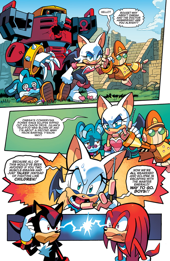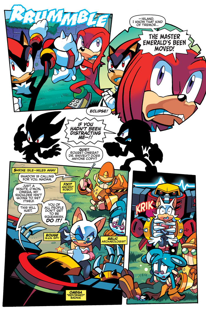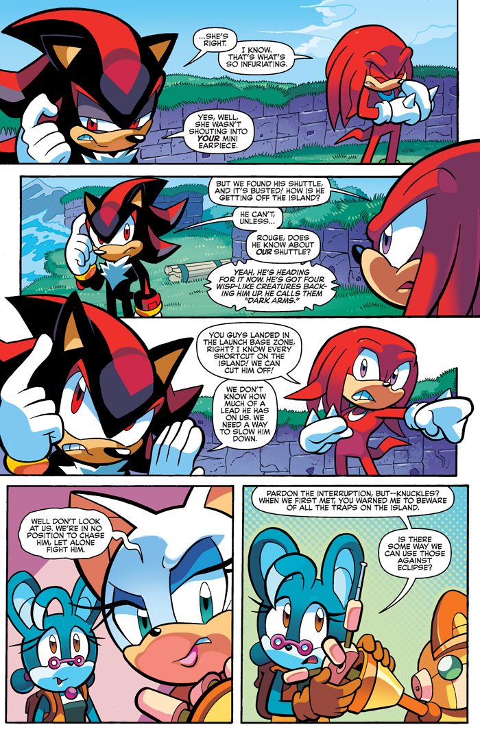 Knuckles and Shadow must end their duel—because Eclipse has escaped with the Master Emerald! Can the two chaos-fueled warriors stand up to the power of the Dark Arms? Knuckles may be forced into the one choice he doesn’t want to make! Don’t miss the sense-shattering finale that will change the shattered world crisis and the Sonic comic landscape as we know it!
