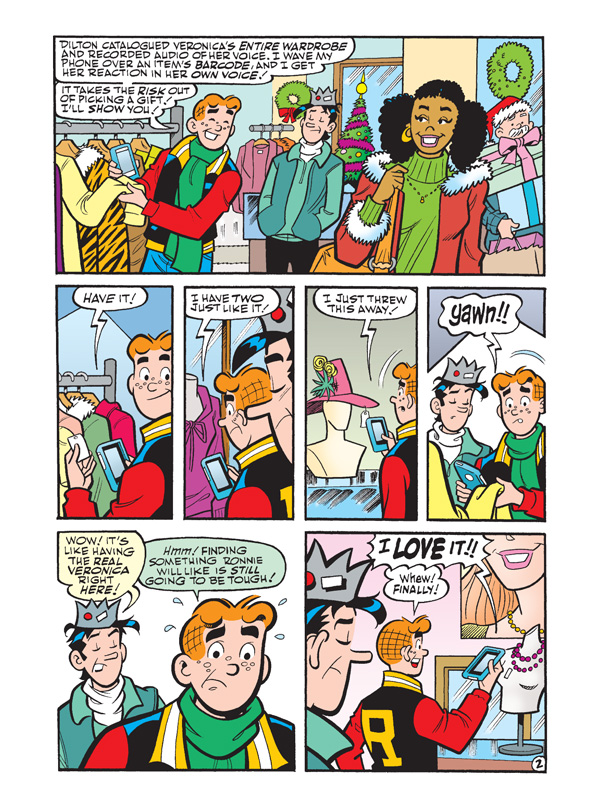 Dilton invents a handy Christmas app that’s supposed to help Archie pick out the perfect gift for Veronica—but even modern technology can’t help find something for the girl who has everything! Archie and Jughead decide the only way they can find something for her that she doesn’t own is by shopping somewhere completely different—and so they recruit their pals to find her the perfect gift. But has the answer been at the tip of their fingers all along? Find out in “The Christmas App,” the festively fun lead story to this comics digest!