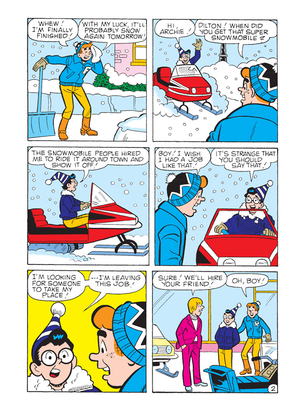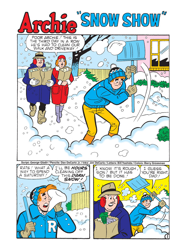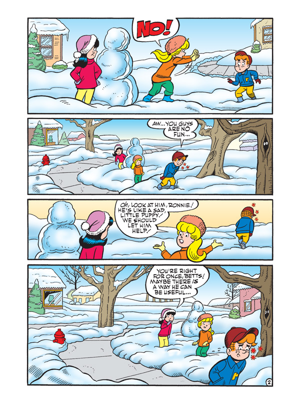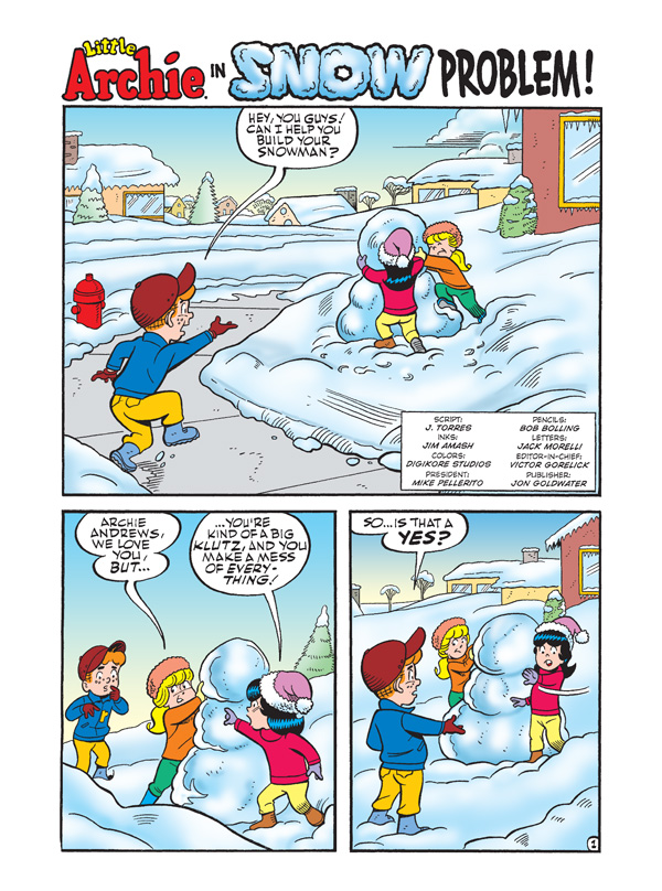 Little Archie is eager to help Betty and Veronica build the best snowman in Riverdale, but his track record of being a klutz makes them reluctant to let him join in on the frosty fun! The gals eventually decide to let him help them out on one condition: he stays far away from the snowman! Can Archie help out without making a mess? Find out in “Snow Problem!” the fun new lead story to this comics digest!