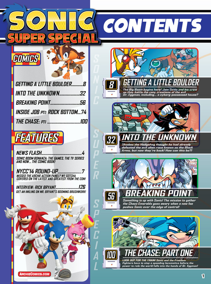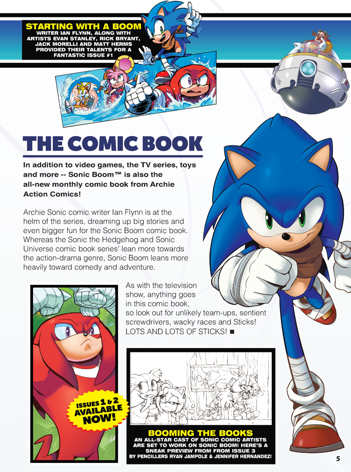 “Sonic Boom-tacular!”: The mega-magazine stuffed with Sonic goodness comes speeding at you with exclusive SONIC BOOM special features, awesome art from the comic series and the inside scoop on the biggest Sonic event in decades! SONIC BOOM is the newest Sonic sensation bringing brand new games, cartoons—and now—comics!