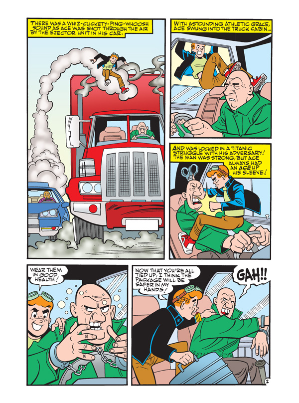 Meet: ACE ANDREWS, ROAD RACER! This speed demon is on a special mission along with his sidekick WHEELS. They have to deliver a secret package and get away from the evil Dr. Dufeg. What is in this mysterious package? If they don’t make it on time—what will happen? The answers to all your burning questions can be found in “Road Racer,” the brand new, action-packed lead story to this fun comics digest!