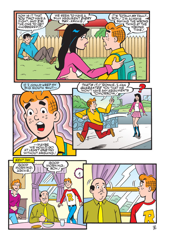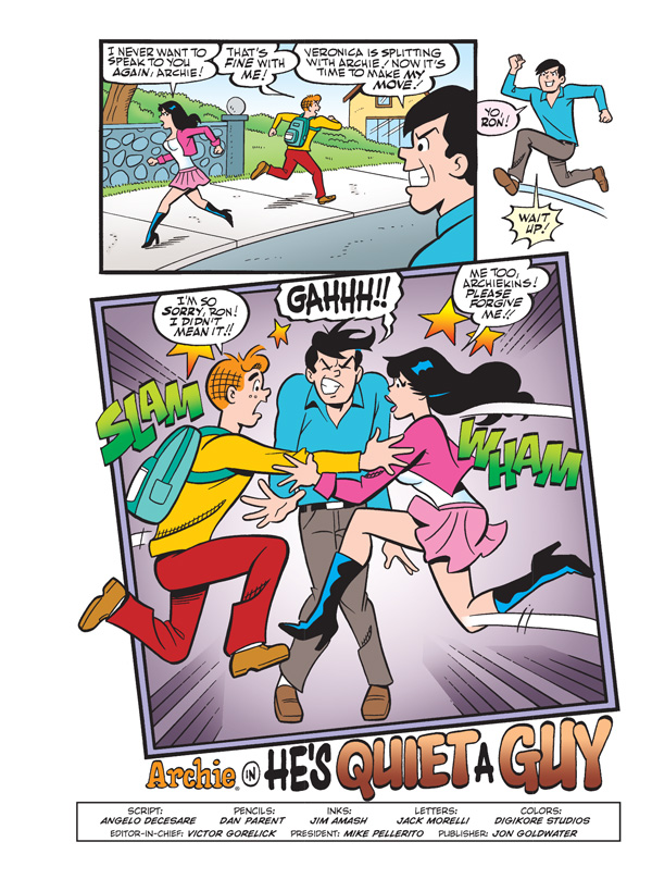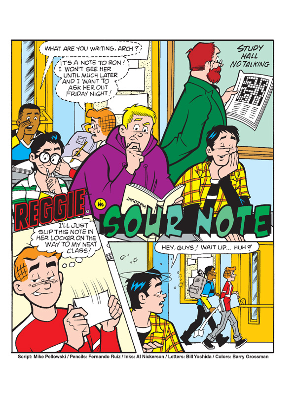 Archie and Veronica can’t seem to go a day without getting into some silly argument, so Archie comes up with a foolproof plan to prevent that from happening—he takes a vow of silence! If he can remain quiet for a whole 24 hours, there’s no possible way he could get into any squabbles with anyone… right? Is Archie’s plan infallible, or will he find himself wordlessly wandering into a war? Throw Reggie into the mix and anything’s possible! Find out Archie’s fate in “He’s Quiet a Guy!” the new lead story to this fun comics digest!