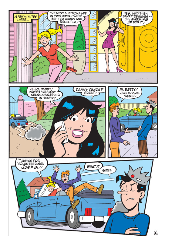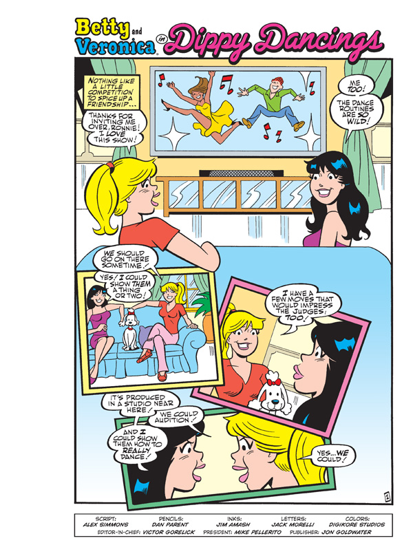 Betty & Veronica are both determined to show off their moves and become contestants on the hot new dancing TV series “SoDance Mania”! They’re ready to flaunt their dancing talents off to the world—and to out dance-number each other, too! The girls do whatever it takes to make sure their skills are top notch—but will they go too far? And will all of their hard work pay off? Find out in “Dippy Dancings,” the entertaining new lead story to this amusing comics digest!