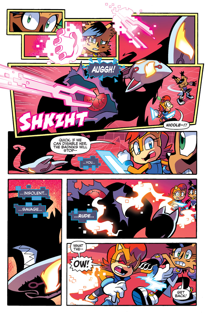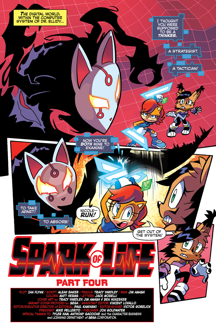 The final showdown for the fate of the digital realm is HERE! “Spark of Life” Part Four: It’s pandemonium aplenty in this conclusion to the stunning “Spark of Life” story arc! Who, or what, is Phage? Introductions aren’t necessary—she’s creating havoc for our heroes anyway! Tails and Big—menaced by badniks and Dark Gaia Monsters alike! A Chaos Emerald—about to fall into enemy hands! Nicole—on the brink of deletion! Will Sally sacrifice it all to save her friends and the world? Only the dramatic conclusion to SPARK OF LIFE can tell! Featuring cover art from Sonic comic artist extraordinaire Tracy Yardley, and a special SEGA-art TAILS variant cover!