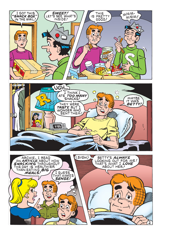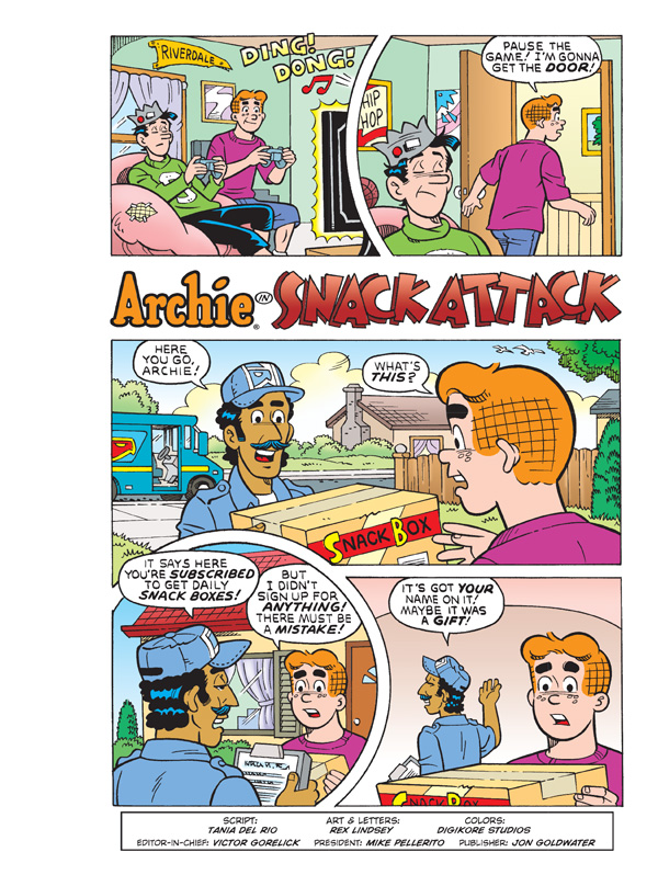 Archie keeps getting a special surprise gift every day: a “snackbox” filled with delicious treats and yummy goodies! The only problem is: he doesn’t know who is sending them, and they won’t stop coming! Will Archie find out the mystery snack supplier before he’s too full to move? Find out in “Snack Attack,” the hilarious lead story to this fun comics digest!