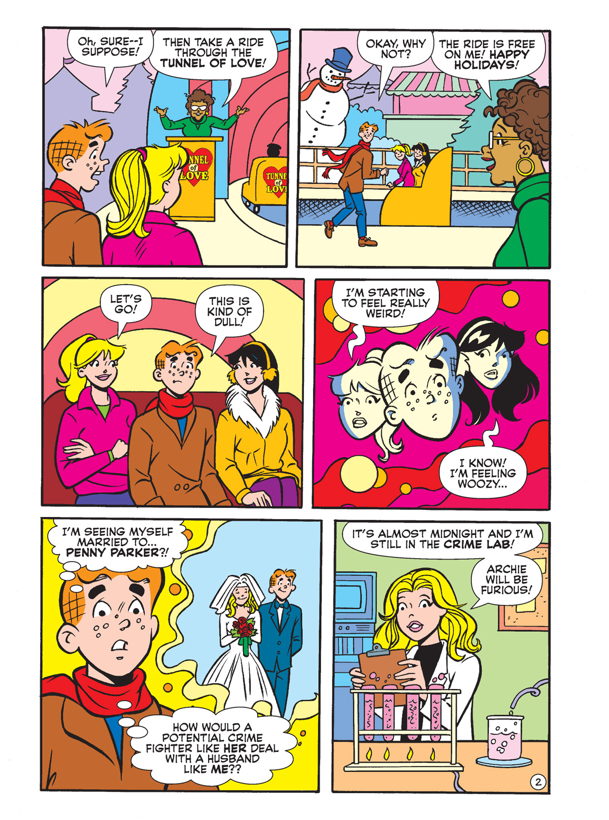 Continuing the tale begun in WORLD OF ARCHIE DIGEST #135 a couple weeks back, the gang’s adventures at the Riverdale Winter Carnival reveal more potential futures with unexpected romantic pairings. This time it’s Archie and . . . Detective Penny Parker?! That’s an interesting duo, and you can find out how it turns out in “‘Tis the Future” by Dan Parent.