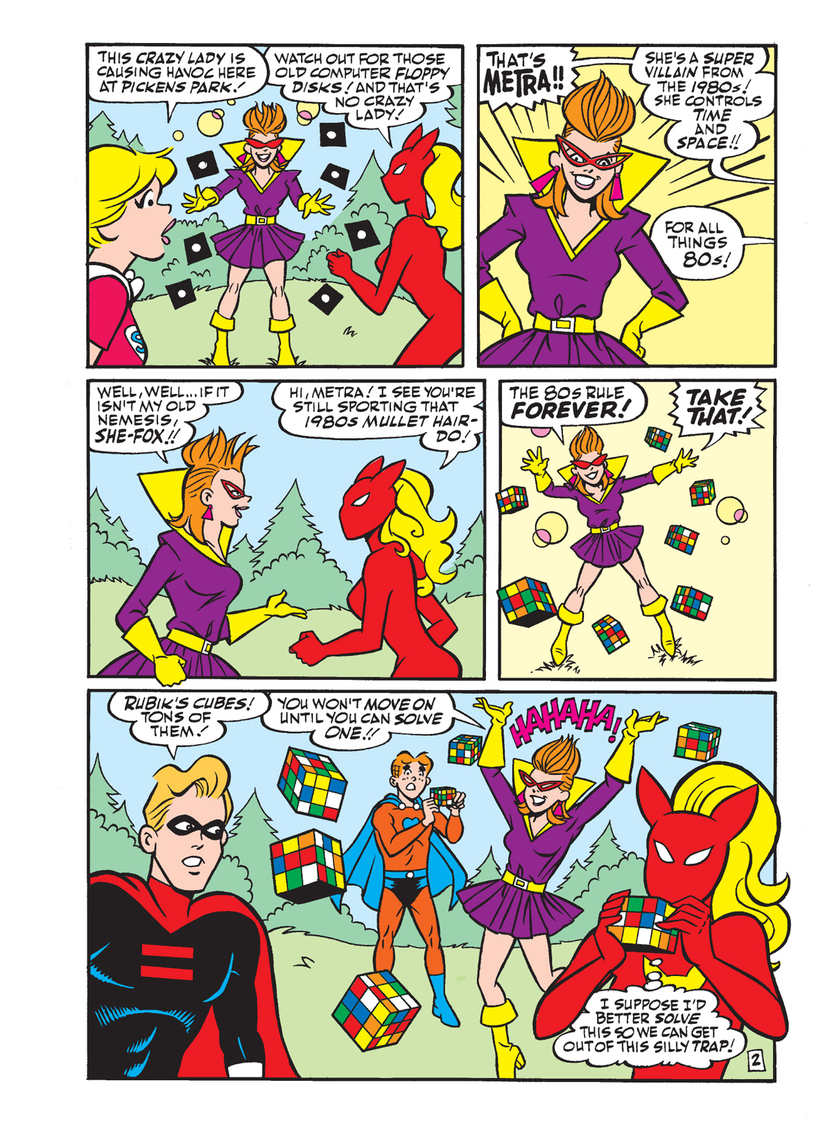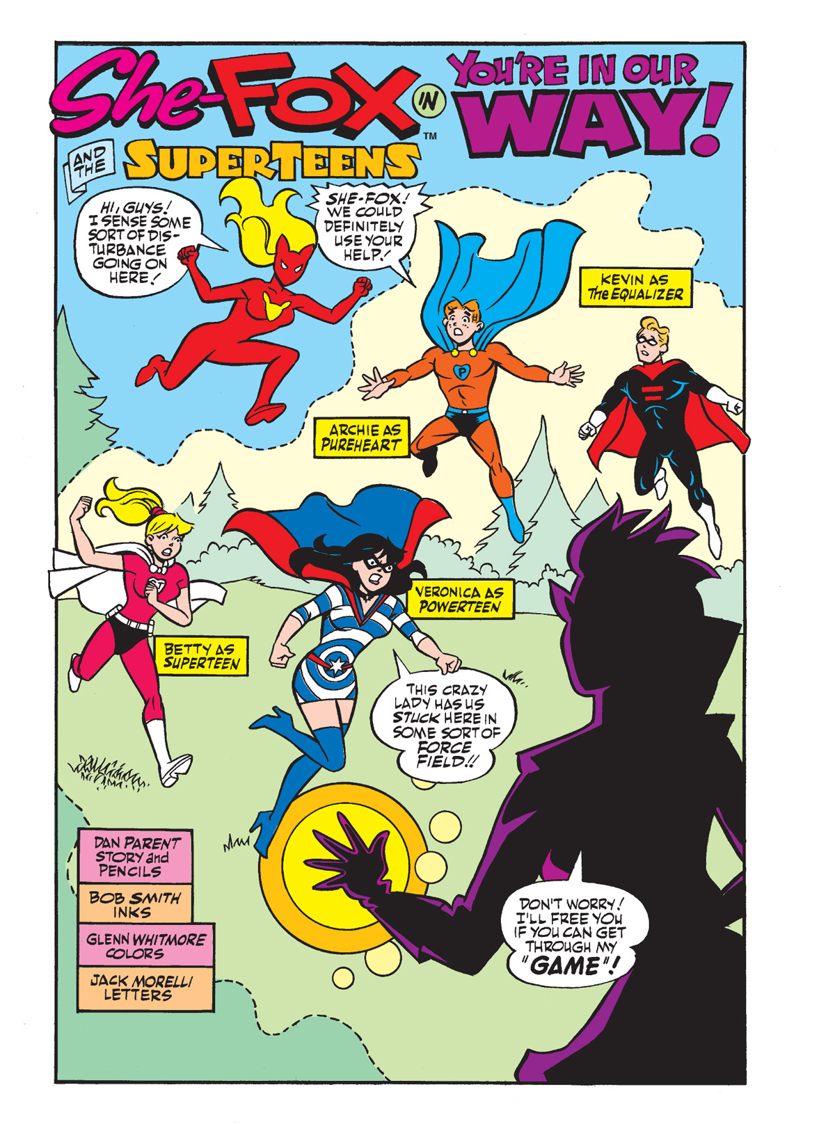 Then, the phenomenal She-Fox teams up with Archie’s SuperTeens to battle Metra, a decidedly retro supervillain! Will she get the upper hand, or will she succumb to the teens’ vicious roasting? Dan Parent tells this time-lost tale!