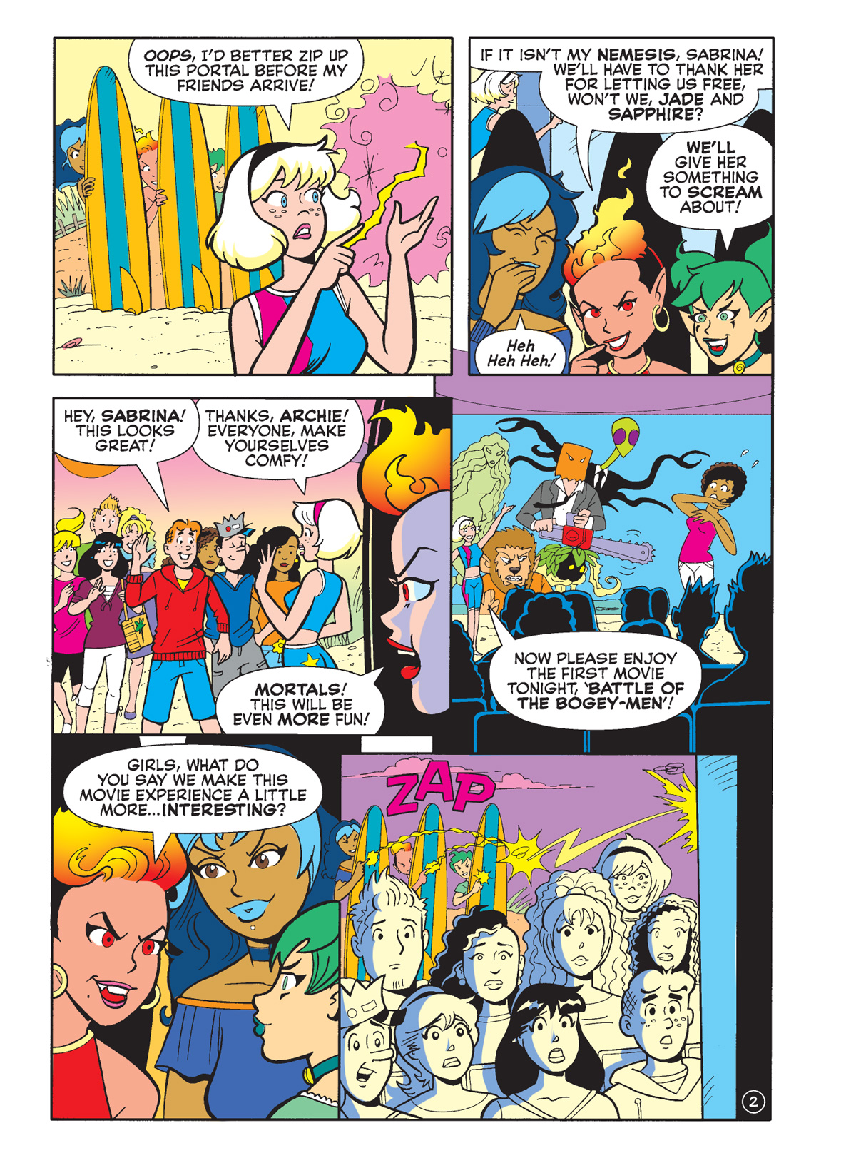 Panels from an Archie Comics story. Sabrina is playing with her cat Salem on the beach under a sign that reads Horror Movie Fest. Behind her, Jade, Amber, and Sapphire, her enemy witches appear in a portal and say Sabrina accidentally left it open for them to join the mortal realm.