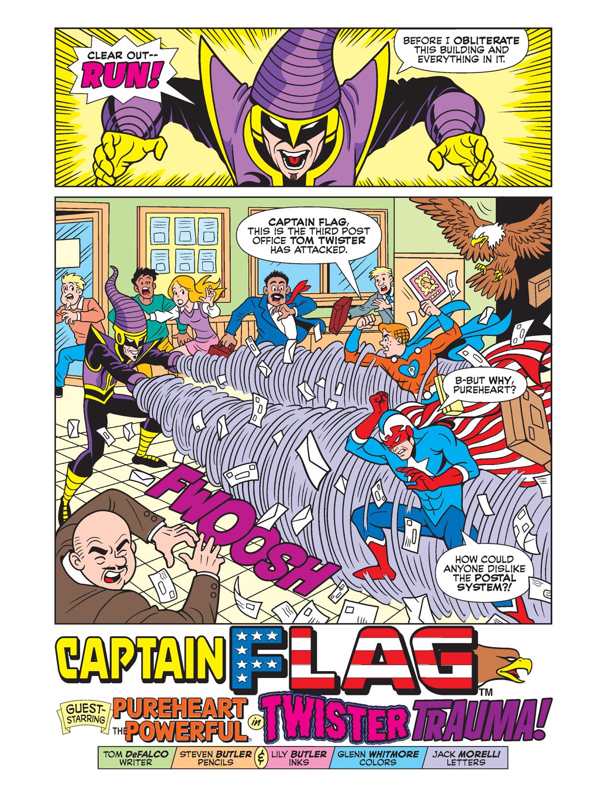 In the new lead story by Tom DeFalco and Steven Butler, Archie’s super-alter-ego teams up with the famous patriotic hero to tackle the tornado-powered bad guy before he can completely destroy the post office. What’s with that grudge against the post office anyway? Only one way to find out!