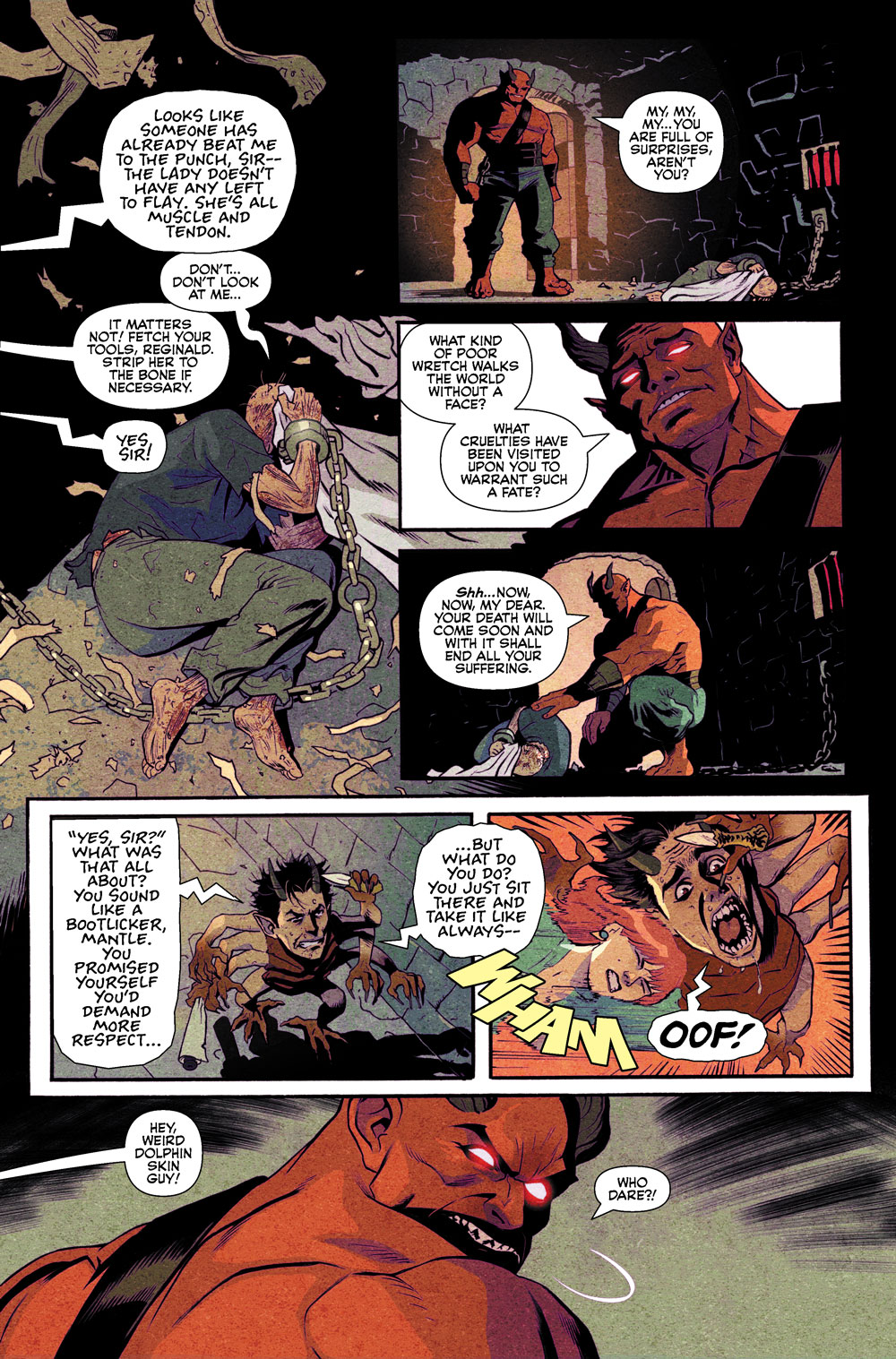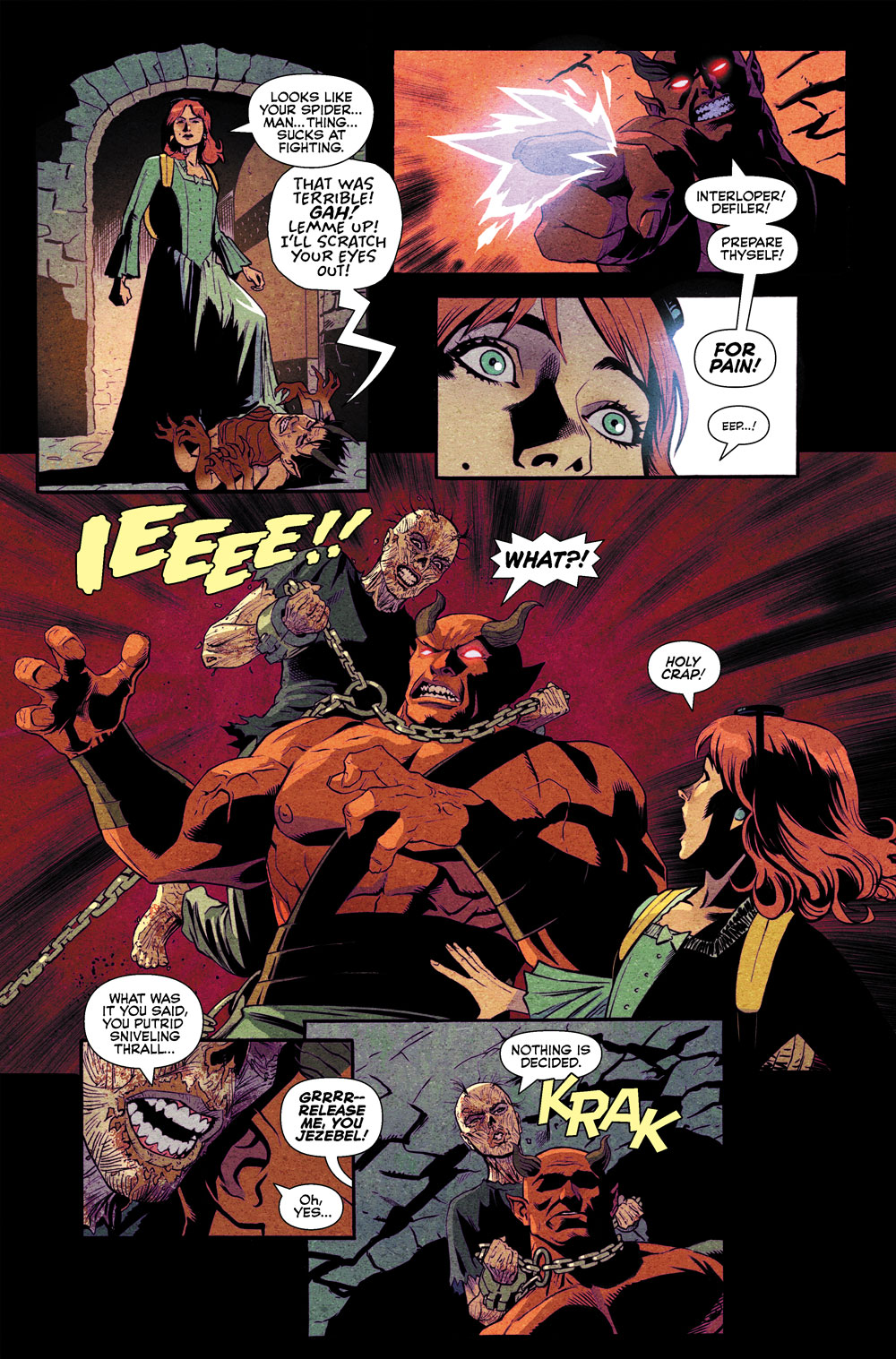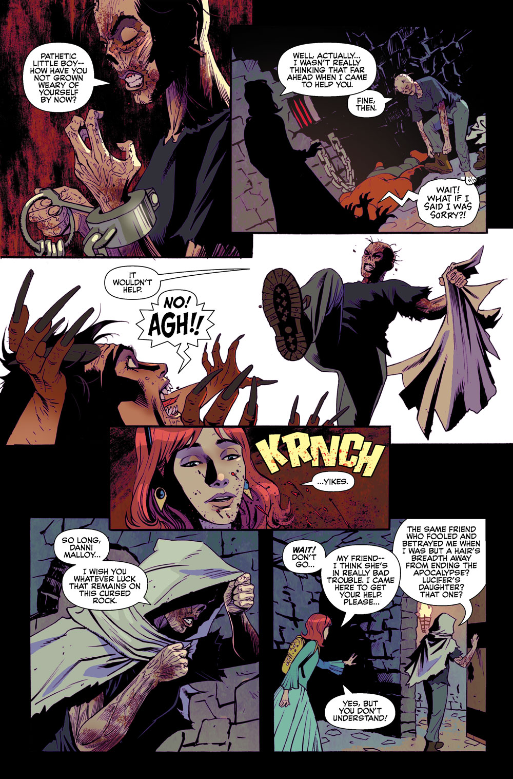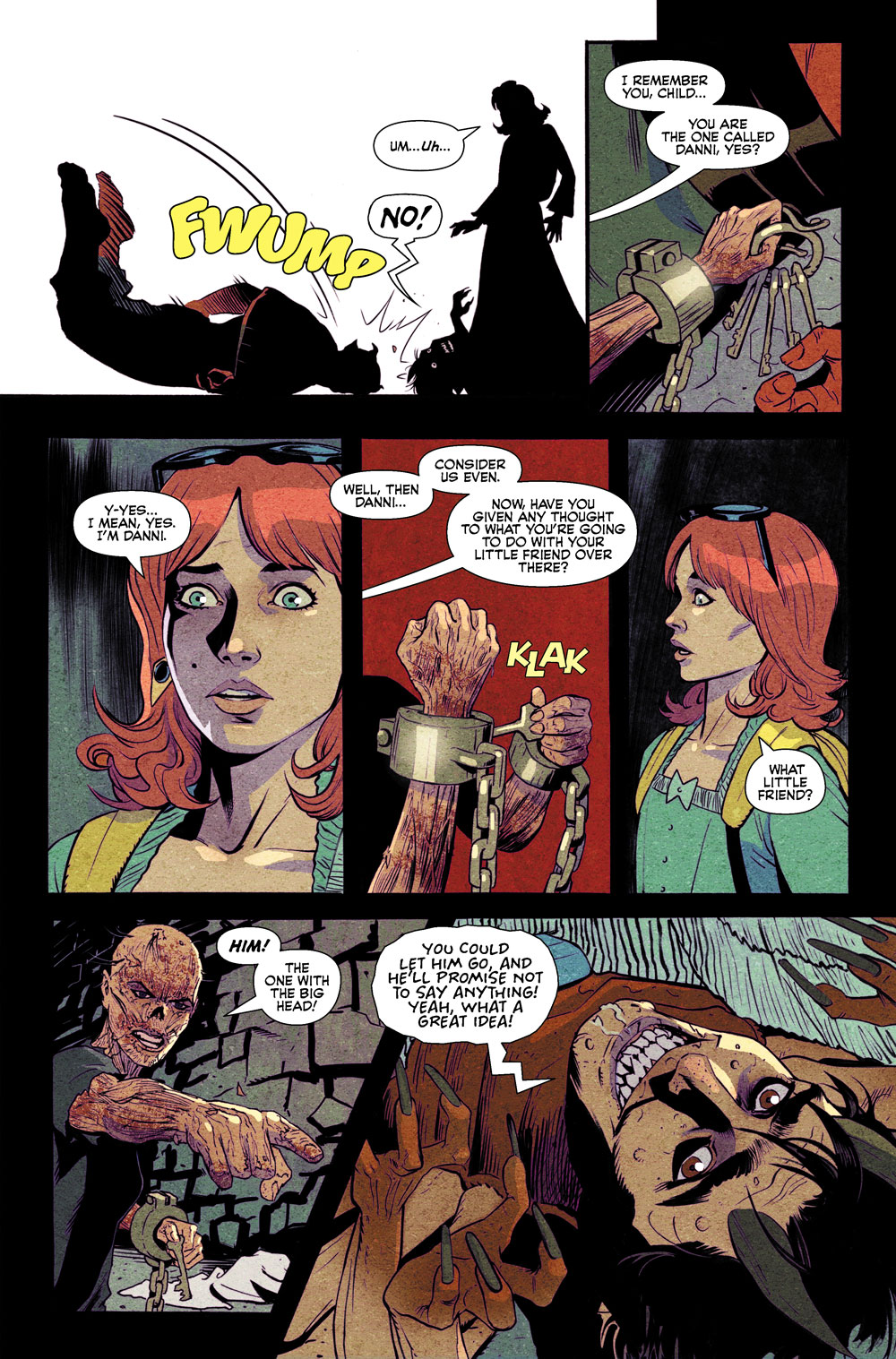A panel from THE CURSED LIBRARY #2. A demon falls to the ground in front of Danni Malloy who says, "Um, uh." The withered hand of an unseen Madam Satan reaches out to grab the demon's keys, aiming to free herself.
