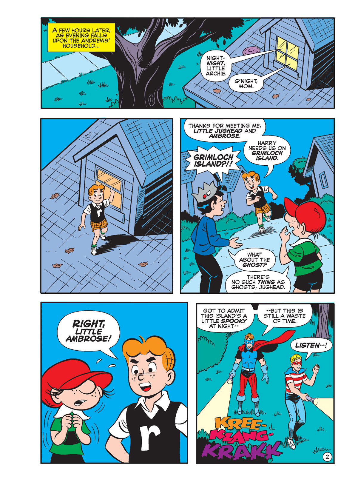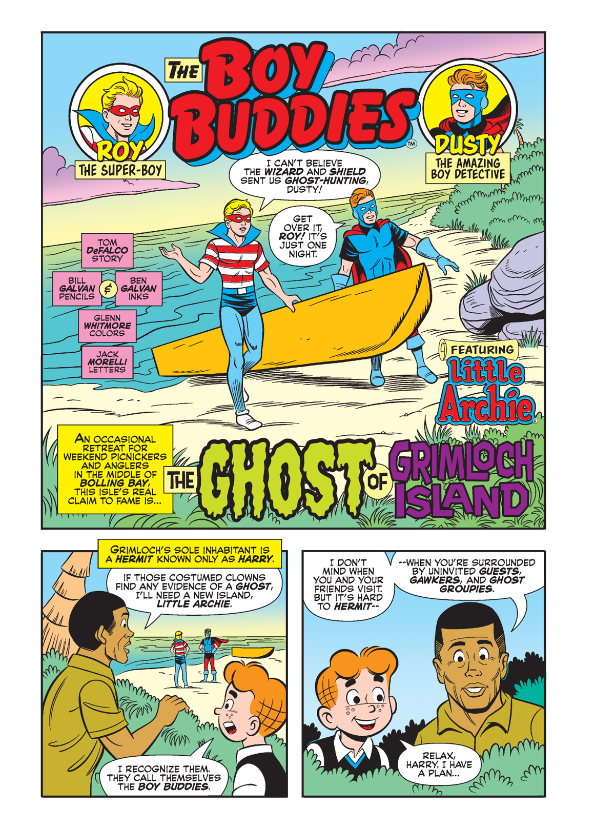 In the first new adventure, by Francis Bonnet and Rex Lindsey, Archie and Jughead try to team up with Fu Chang, but can they keep up with his flying fists of crime-fighting fury? I bet you can guess! Then, in a rare new Little Archie tale by comics legend Tom DeFalco and Bill Galvan, rumors of a haunted island attract the attention of Roy and Dusty, the superheroic Boy Buddies . . . but who’s haunting whom in this ghost story?