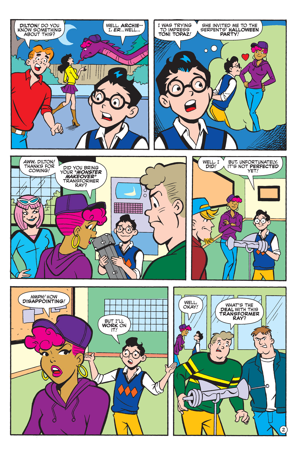 In “Trick of Trick,” an all-new story by Dan Parent, Dilton tries to impress Southside’s Toni Topaz with a monster transformation ray (couldn’t he have tried flowers?). Pretty soon, Riverdale’s rivals the Southside Serpents are wreaking havoc all over town in their new, somehow creepier forms. You can start reading with the preview below, and find out what happens next when you grab your own collectible copy!