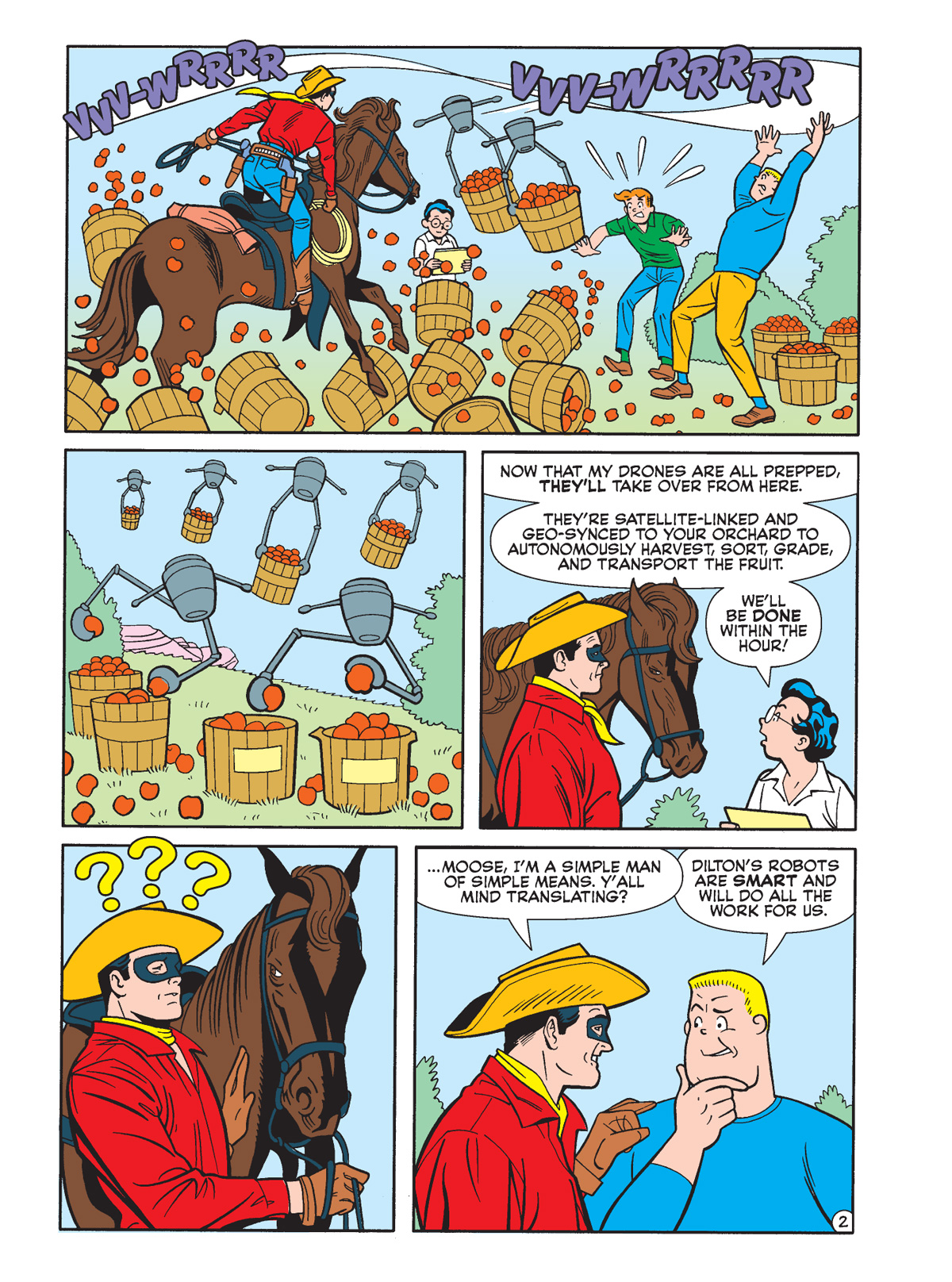 First, in “Man vs. Machine” by Ian Flynn and Pat Kennedy, the cattle rustling action hero Nevada Jones enlists the gang for help on his apple orchard, but when Dilton tries to make things easier with an invention, well . . . he doesn’t!