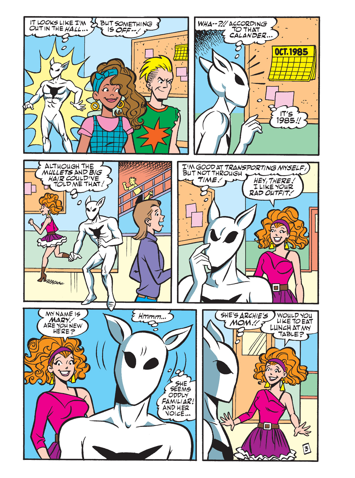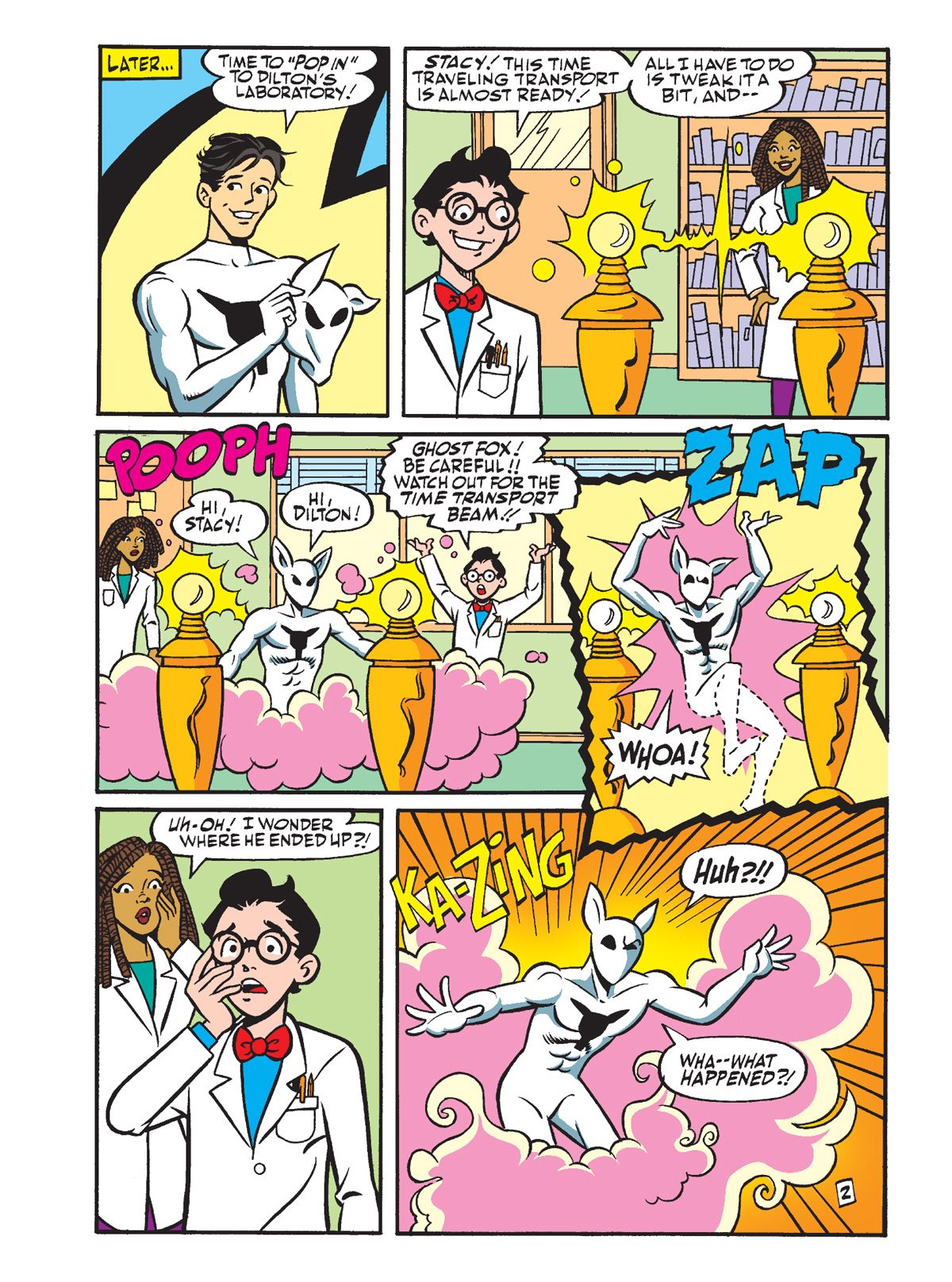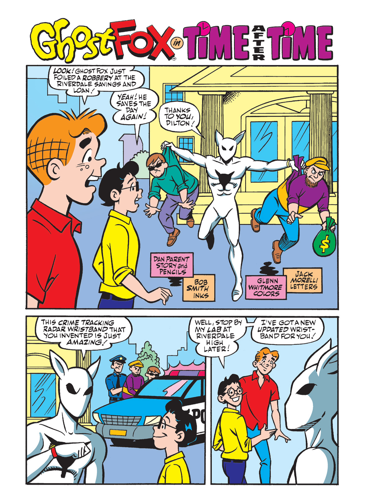 Then, Shinji Patton, a.k.a. Ghost Fox, returns after last week’s adventure in “Time After Time” by Dan Parent. This time, Dilton is helping the mysterious masked crime fighter fight crime, but things go totally tubular when he accidentally sends Shinji back to 1985.