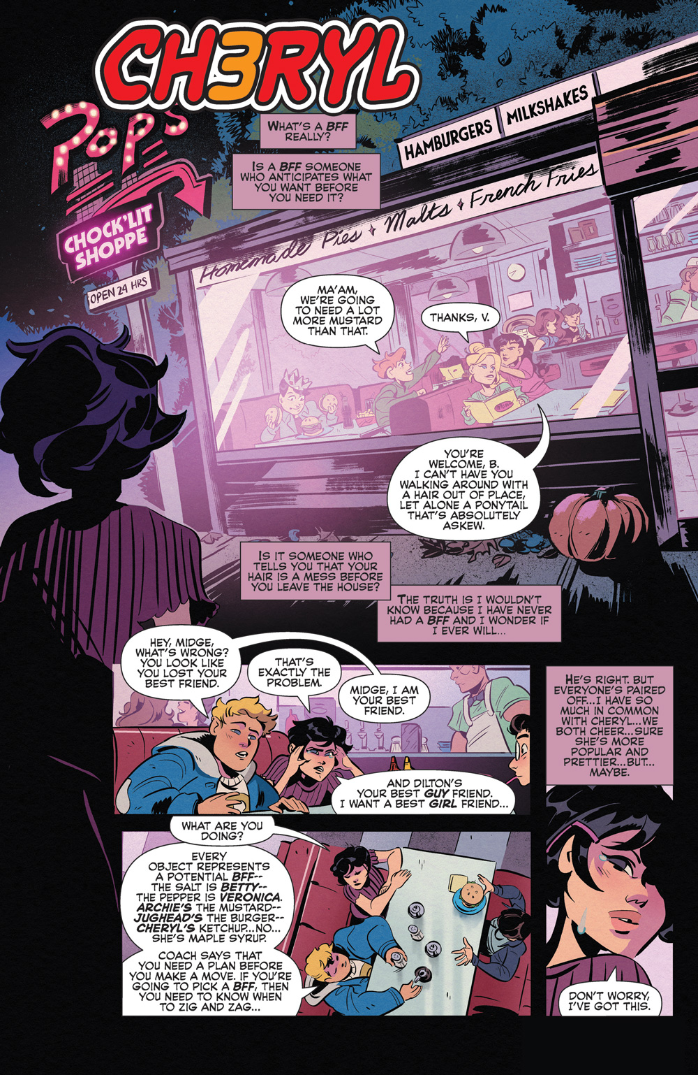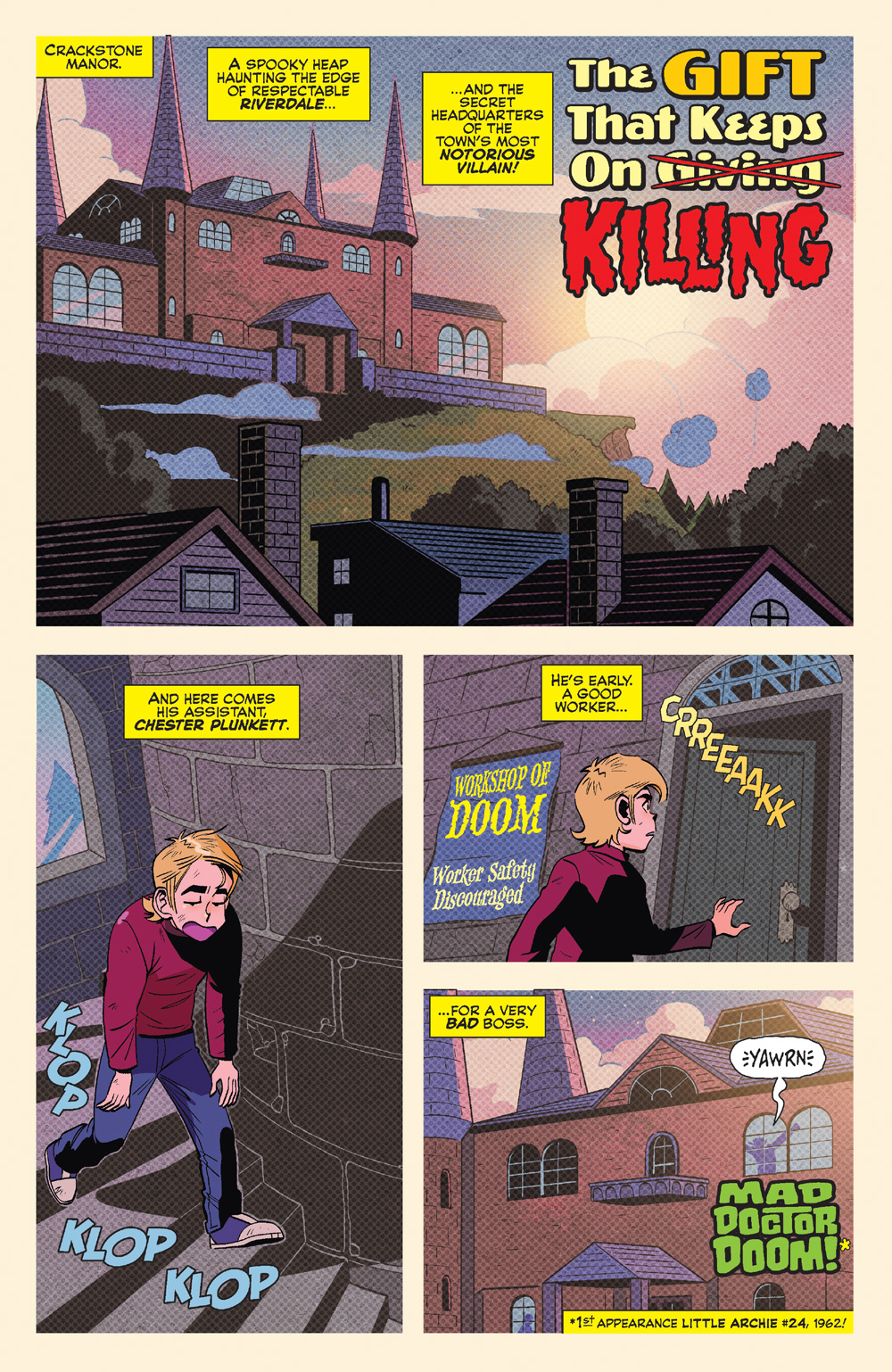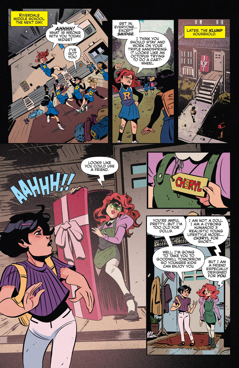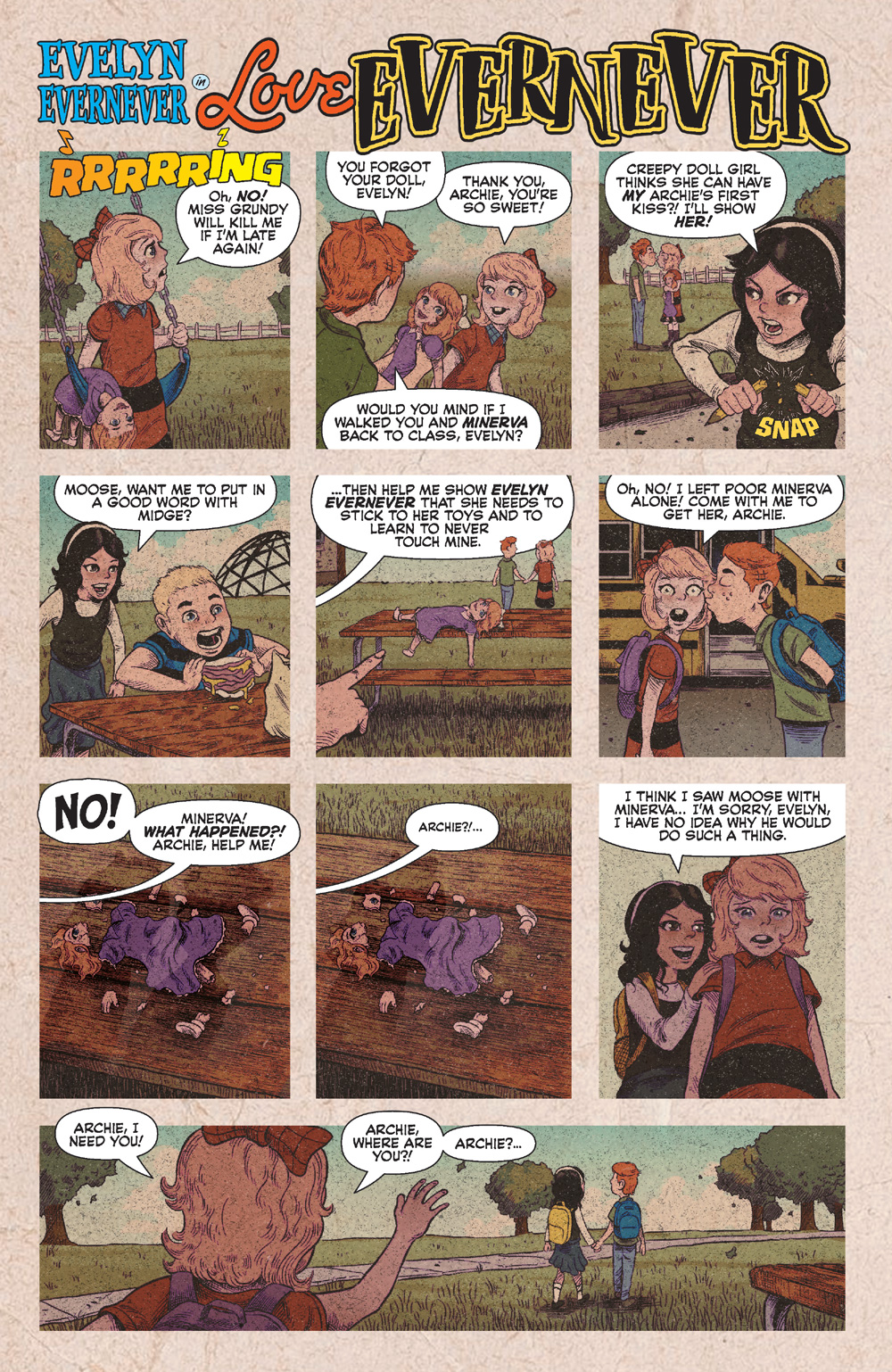 Long-time Archie fans will recognize Evelyn from classic “Little Archie” stories, in which she gave Archie his first kiss and always carried an admittedly kinda-creepy doll with her everywhere she went. That famous toy sparks a series of events leading to “CH3RYL” by Danielle Paige and Tango and “The Gift That Keeps on Giving Killing” by Michael Northrop and Ryan Jampole.