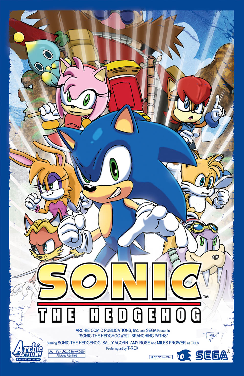 EVERYTHING CHANGES when SONIC and friends go down their “Branching Paths”: The Shattered World Crisis is behind us, and the 25th Anniversary was well celebrated! So what’s next for Sonic and his friends? That’s up to them to decide! Sonic is racing around Westside Island on a mission—but for whom? And while Sonic’s away, each of his friends make decisions that will plot the course of their lives. Don’t miss out on the beginning of a whole new era of Sonic stories! Featuring cover art by Sonic comics veteran Tracy Yardley and a “Epic Movie Poster” variant by T. Rex!