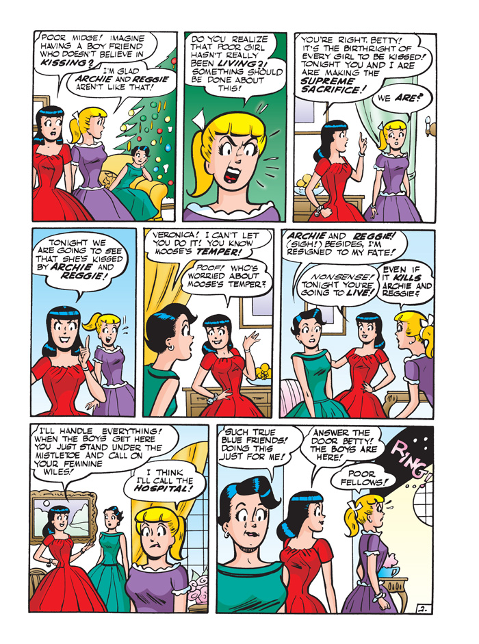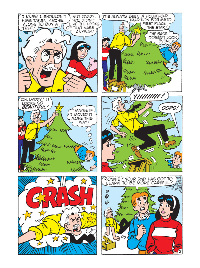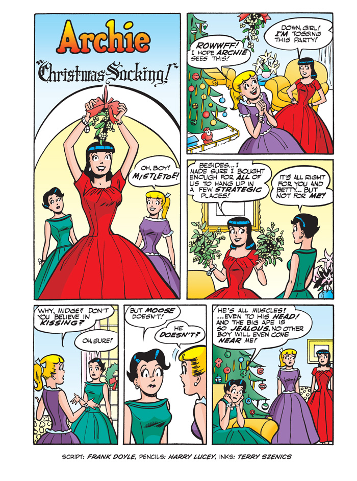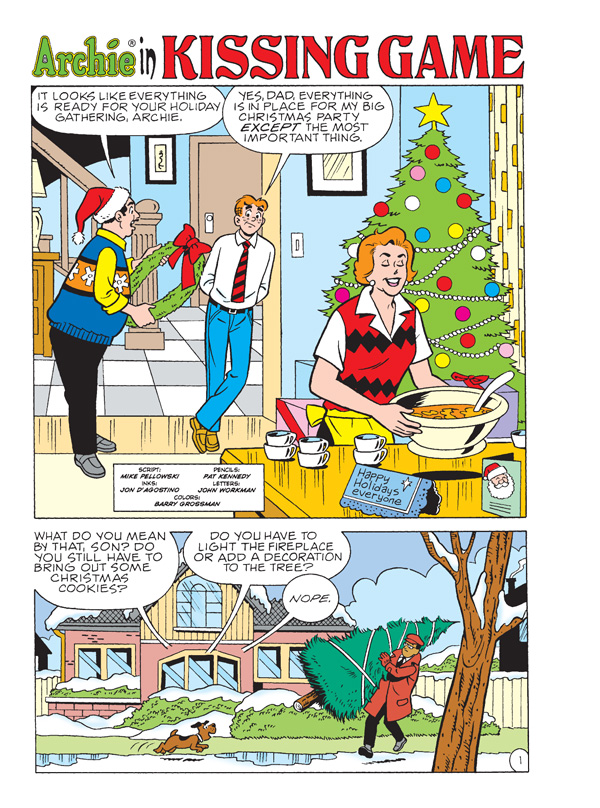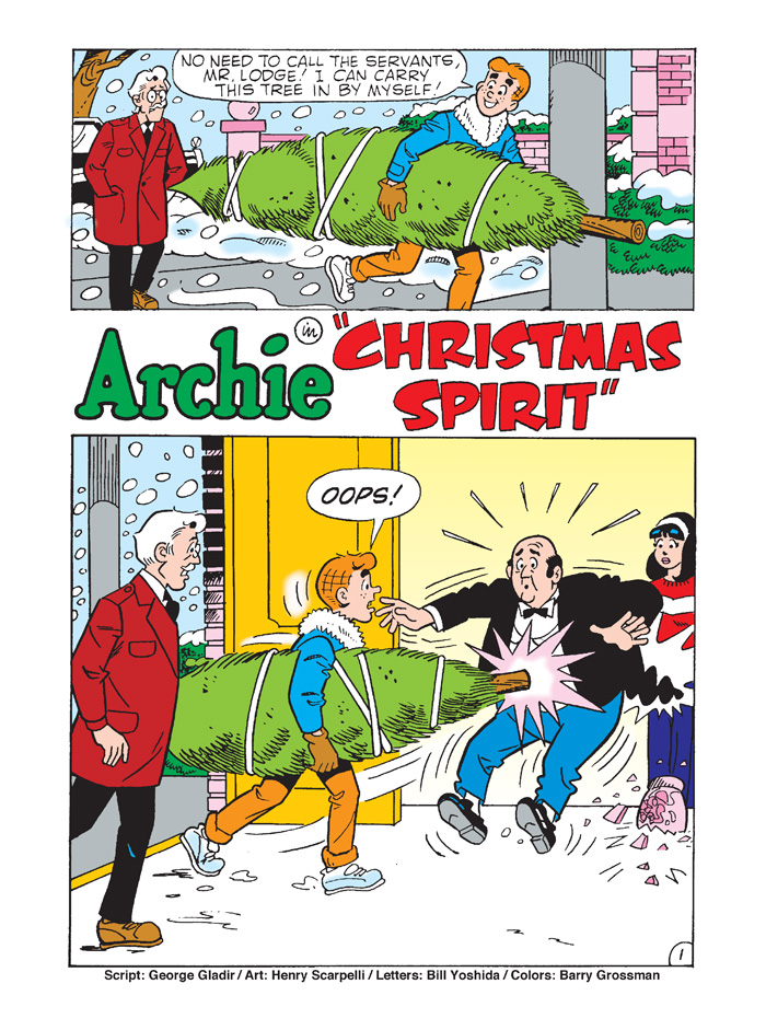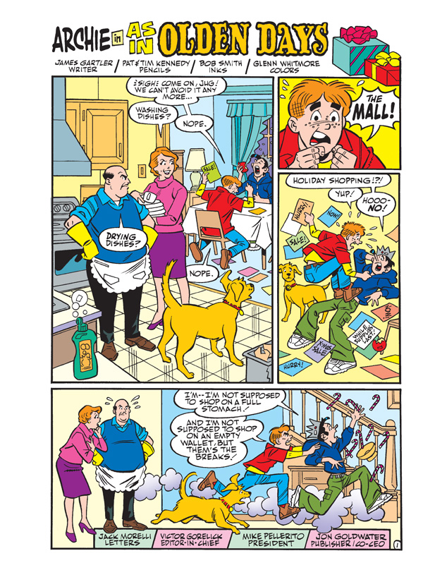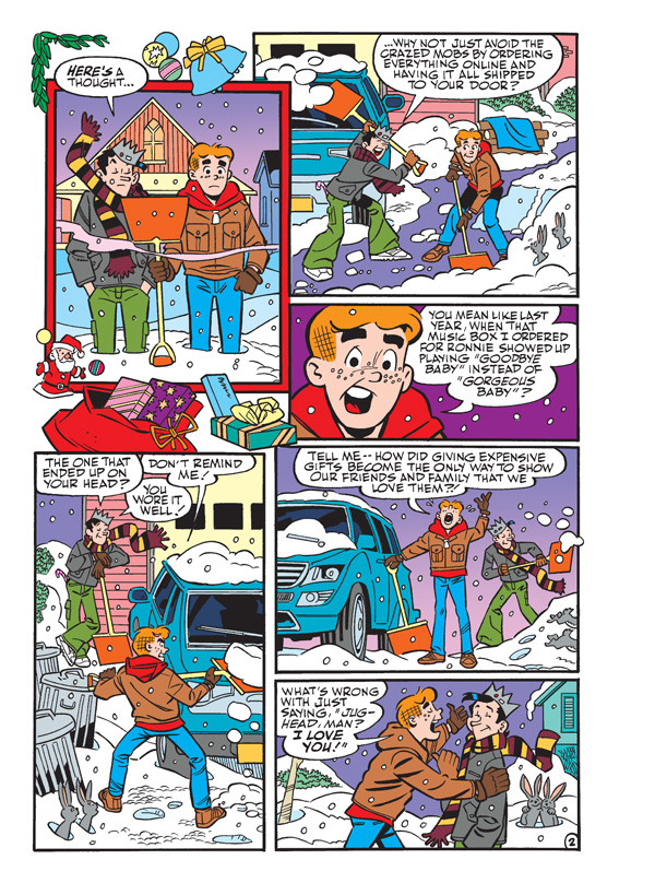 With the pressure on to get holiday shopping done, Archie and Jughead wonder if there isn’t a better way to get into the spirit of the season, especially if getting to the mall first requires moving mountains of snow! Might these two philosophers manage to spread goodwill without losing a dime… or will they be forced to spend in order to celebrate? Find out in “As in Olden Days,” the fun, festive new lead story to this JUMBO-SIZED comics digest!