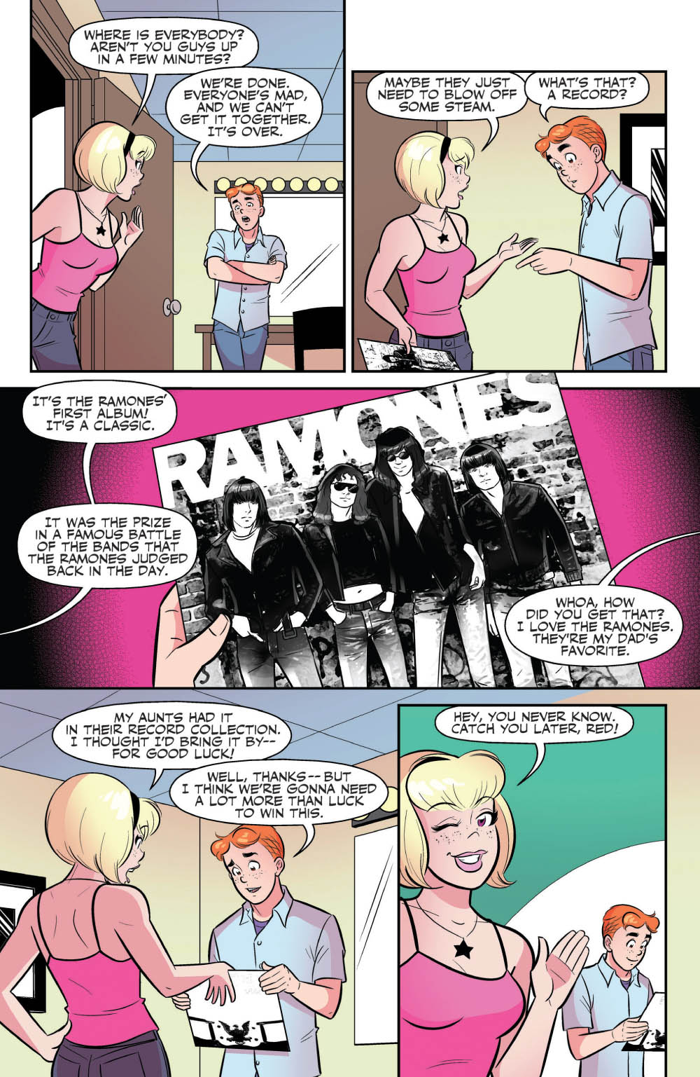 When the Archies tank at the Riverdale High Battle of the Bands, a magical twist of fate sends them hurtling into the past—and face-to-face with none other than the Ramones! Can the legendary punks get the Archies to realize their own rock ‘n’ roll potential and find their way home? Probably not—but it’ll be a blitzkrieg bop of a journey, as the two bands bounce from 53rd and 3rd to Rockaway Beach in this must-read crossover from the writers of the best-selling ARCHIE MEETS KISS and WE CAN NEVER GO HOME with jaw-droppingly beautiful art from Gisele Lagace (“Occupy Riverdale”)!