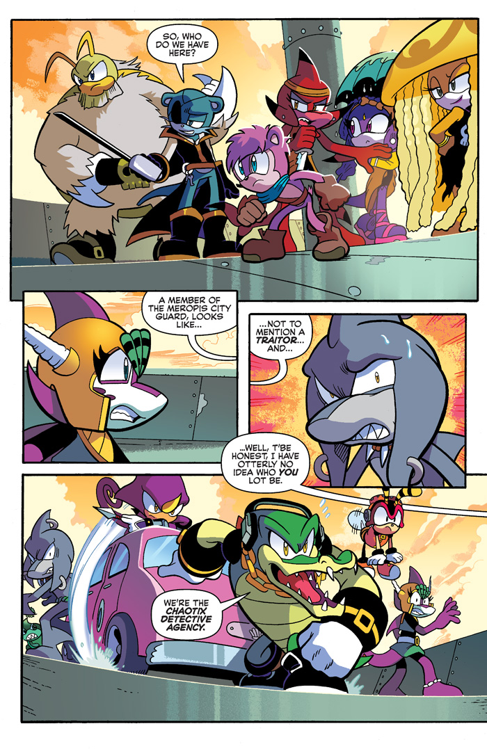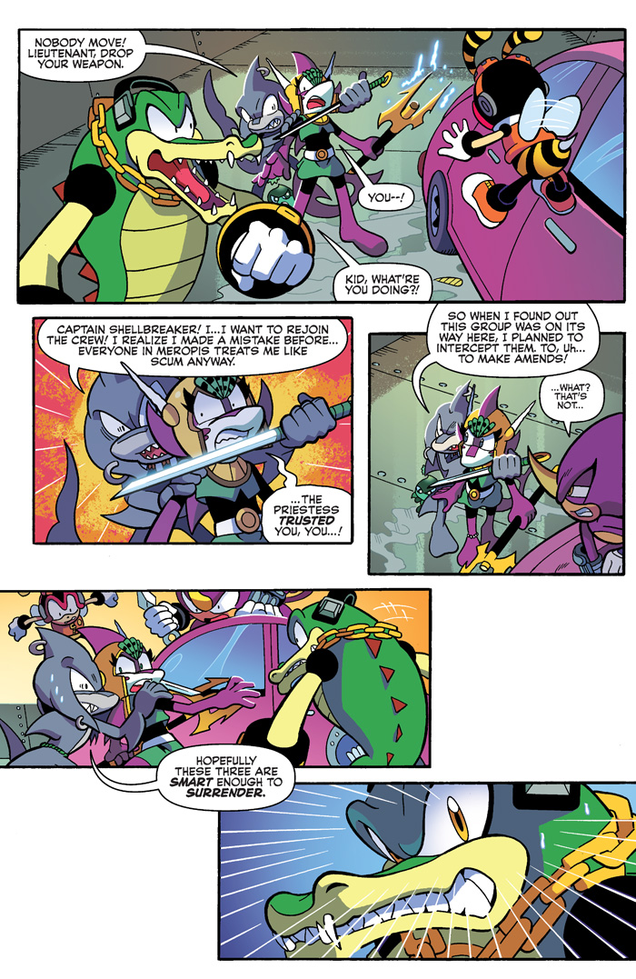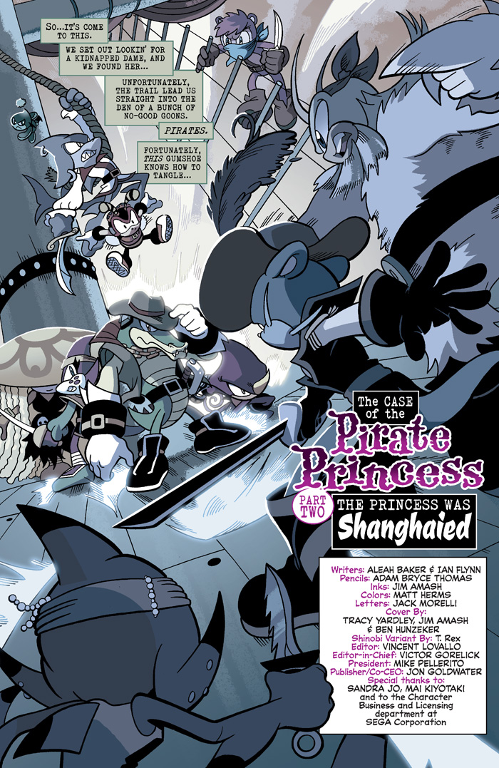 ENTER the DEPTHS of DANGER in “The Case of the Pirate Princess” Part Two: The Chaotix have tracked down the princess of Meropis and the pirates that kidnapped her – but now they’re prisoners as well! And Vector’s daring plan to escape… is to join them?! It’s mysteries and revelations galore as the Chaotix hit the high seas! Featuring cover art by Sonic comics veteran Tracy Yardley and a “Shinobi” variant by monster-talent T-Rex!