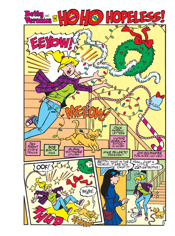 Betty’s been tasked with putting up her family’s tree—a Christmas chore that Veronica finds criminally boring! But when Betty’s annoying new neighbor Holly brags about her family’s elaborately designed house always winning best decorated on the block, a fire so big you could roast chestnuts over it is ignited within Ronnie—and she’s determined to make sure her BFF has the best and brightest house in town. Can they make it happen? Find out in “Ho-Ho-Hopeless!” the fun new lead story to this Holiday Annual featuring even more pages of festive fun!