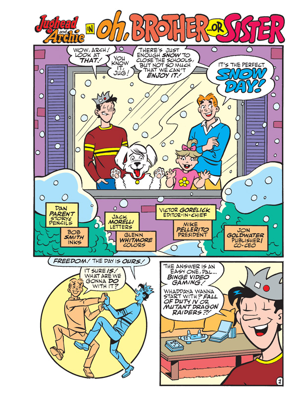Archie and Jughead get saddled with taking care of Jughead’s little sister Jellybean for the day. When they decide to take part in some outdoor winter fun, it turns out that Jellybean has her own ideas of fun… and it doesn’t involve skiing or sledding! Find out what Jellybean’s got in store for them in “Oh, Brother…or Sister!” the fun new lead story to this winter annual featuring even more pages of winter wonder!