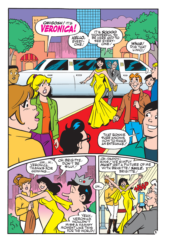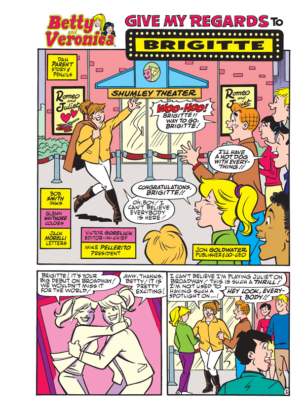 Join the world-famous Betty & Veronica for some fabulous fun and fantastic fashion in this comics double digest featuring an ALL NEW LEAD STORY! In “Give My Regards to Brigitte,” songstress Brigitte Reilly makes her Broadway debut—but a rude Veronica in the audience creates a scene that will be tough for Brigitte to overcome!