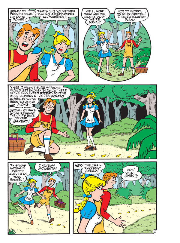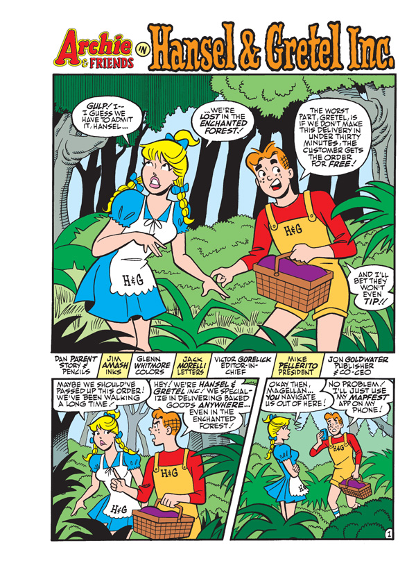 STORYBOOK MONTH continues! In “Hansel and Gretel.Inc,” Hansel (Archie) and Gretel (Betty) run a smooth delivery service in the Enchanted Forest—until they come across the glutton known as “Sir Jughead”! He’ll eat anything that’s not nailed down… including them!