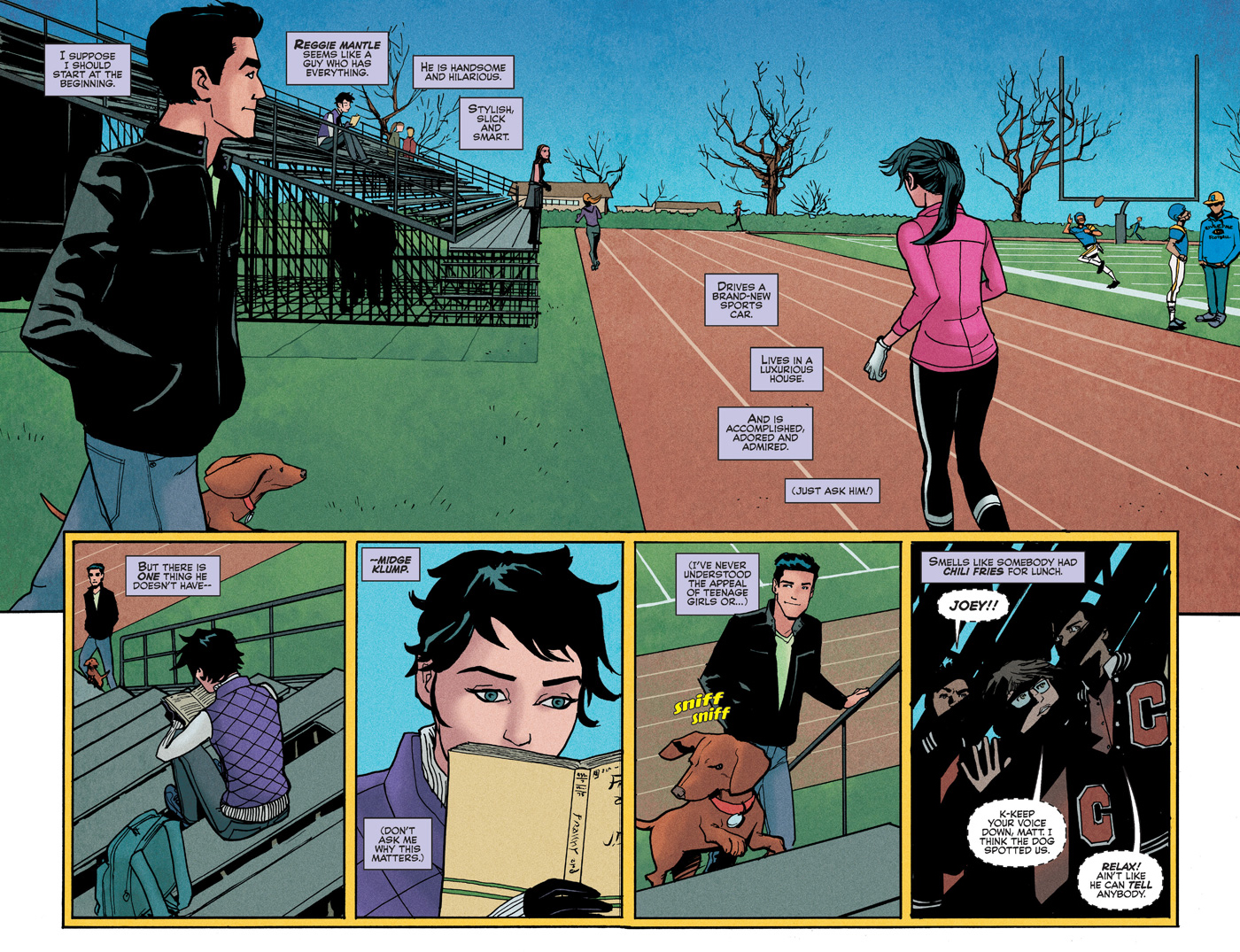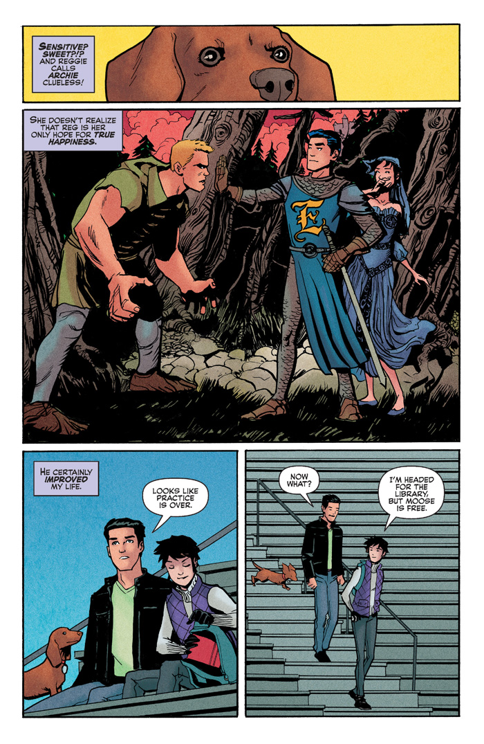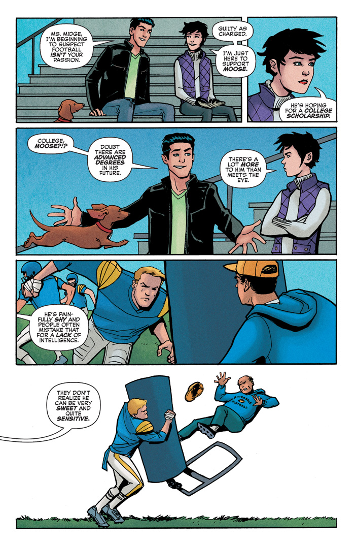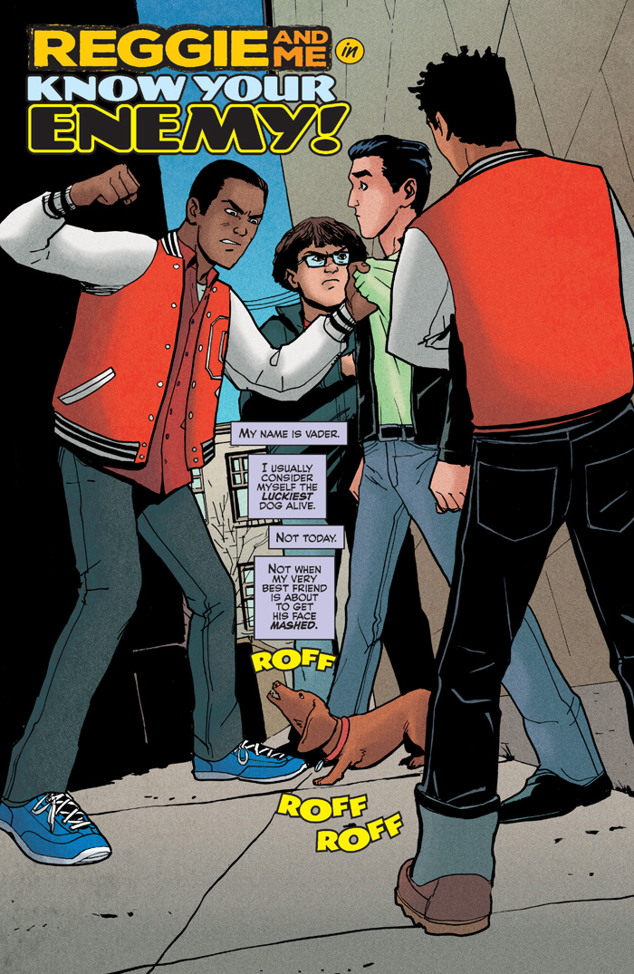 In the third installment of this five-issue miniseries, everyone thinks they know Big Moose. They’re wrong. Determined to rid himself of both Moose and Archie, Reggie exploits his new “friendship” with the big guy to learn, “The Secret Life Of Moose Mason!” Reggie uncovers surprising truths about Moose’s family and his troubled past. He discovers the real reason why Midge is so devoted to Moose. He exposes the big guy’s hopes, dreams and fears. Teemed with his beloved dog Vader, Reggie begins to plant the seeds that will eventually lead to Moose and Archie’s expulsion from Riverdale High.