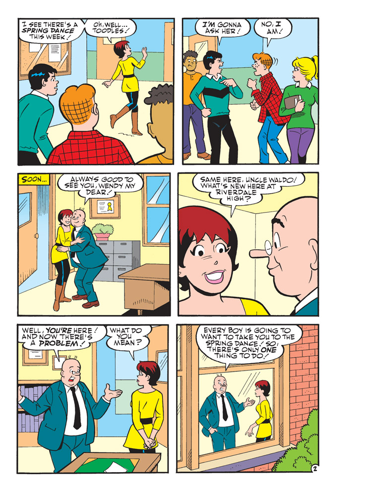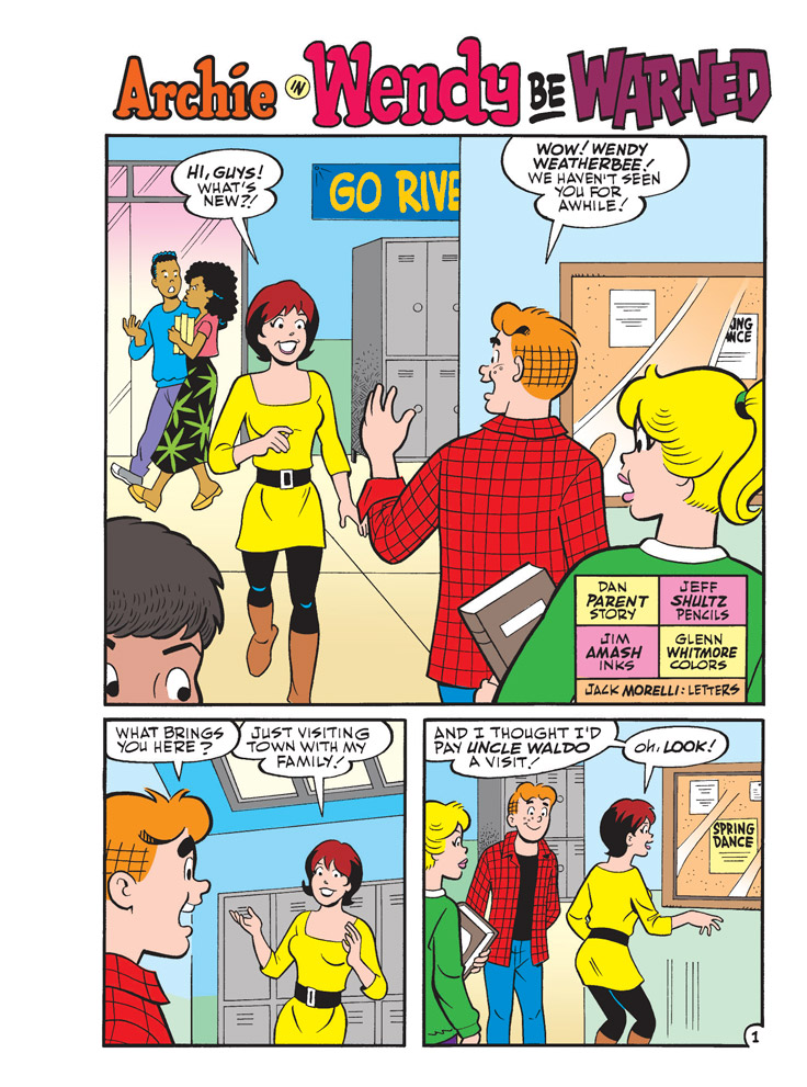 Get ready for some entertaining all-new classic-style Archie stories for one low price! This issue features two stories filled with dating disasters and career commotions—plus some fun cameos! In “Wendy, Be Warned,” Mr. Weatherbee’s niece, Wendy, is visiting town. She wants to go to the spring dance, and it’s up to Mr. Weatherbee to play matchmaker for her! Then in “Game Plan,” Archie’s new job is seriously interfering with his video game time—unless he can find a way to merge the two!