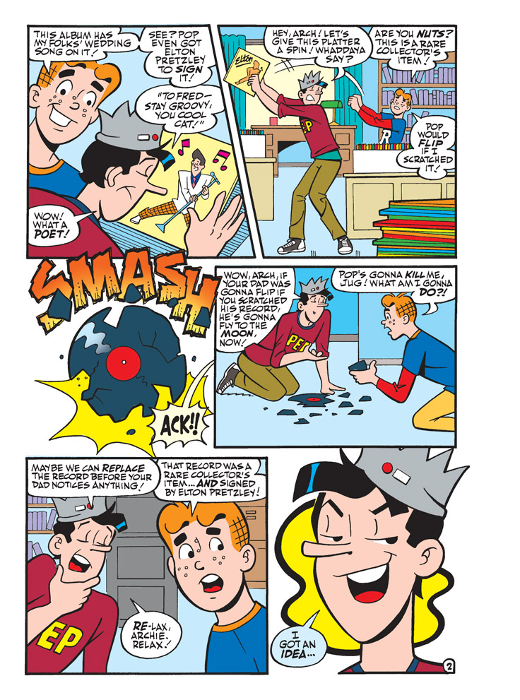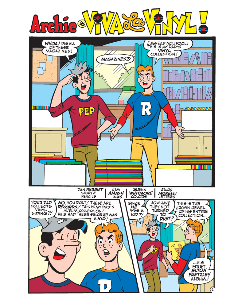 Brand New Lead Story: “Viva La Vinyl!” Collecting vinyl records has returned in popularity, and Archie is really getting into his parents’ vinyl record collection—but what will he do when he accidentally destroys his dad’s prized Elton Pretzley album?