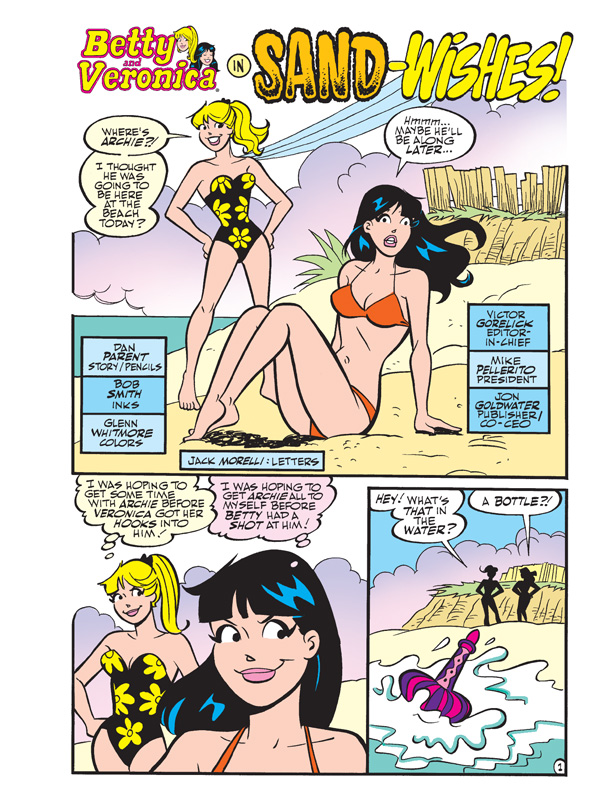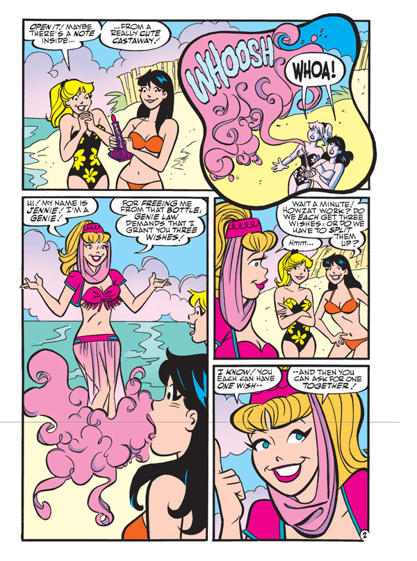 On a fateful trip to the beach, Betty and Veronica accidentally release a genie from her bottle, and she’s willing to grant them three wishes. Will they get everything they want? Or will they wish they had never met her in the first place? Find out in “Sand-Wishes,” the fun, new lead story to this summer annual—featuring even more pages of fun in the sun!