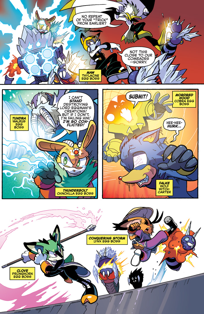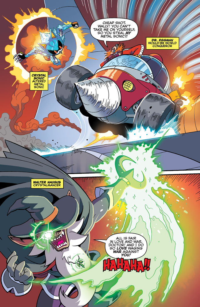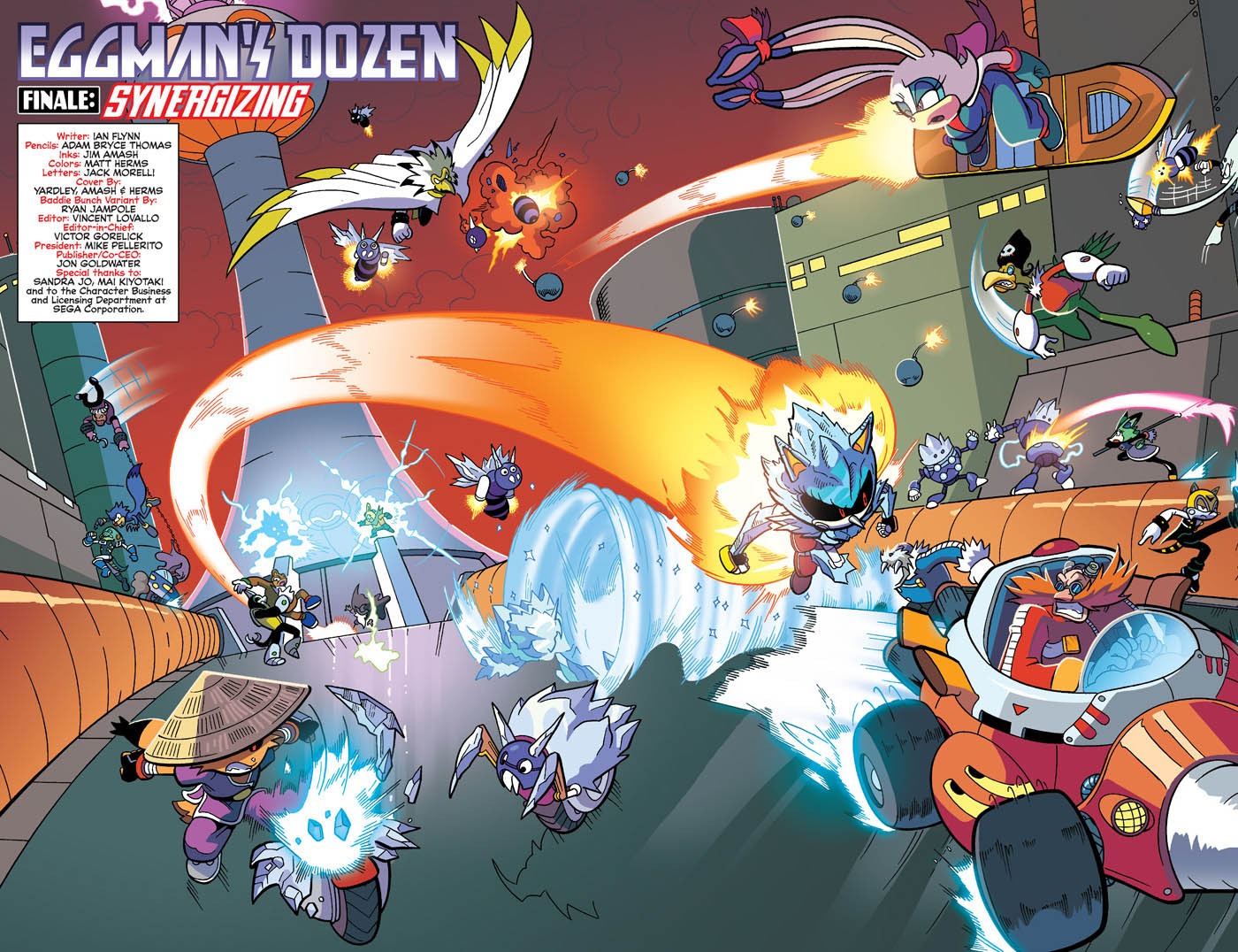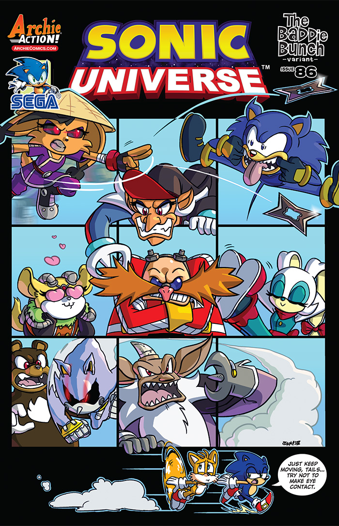It’s the END for EGGMAN in “Eggman’s Dozen” Part Four: The final, frantic fracas is here! Dr. Eggman and his Egg Bosses square off against the Naugus Twins and the fearsome Crystal Sonic! Will everyone make it out of the battle alive? And who is the twelfth and final Egg Boss? All the action and answers are here! Featuring cover art by Mr. Sonic comics, Tracy Yardley and a “Baddie Bunch” variant by the radical Ryan Jampole!