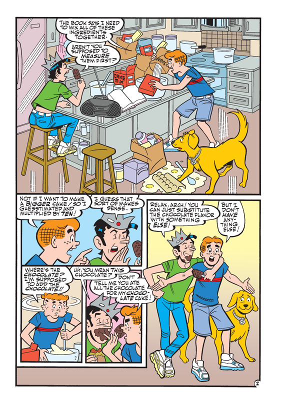 Archie wants to do something special for Betty’s birthday, so he decides to bake a cake—unfortunately, Archie’s never actually tried to bake a cake before! But how hard can it be? With his good pal Jughead by his side, he should be able to accomplish anything he sets his mind to. Providing, of course, that Jughead doesn’t eat everything before he even gets a chance to start baking! Will Archie give Betty the best birthday gift ever? Or is this plan a cake mistake? Find out in “Caketastrophe,” the fun lead story to this JUMBO-sized comics digest!