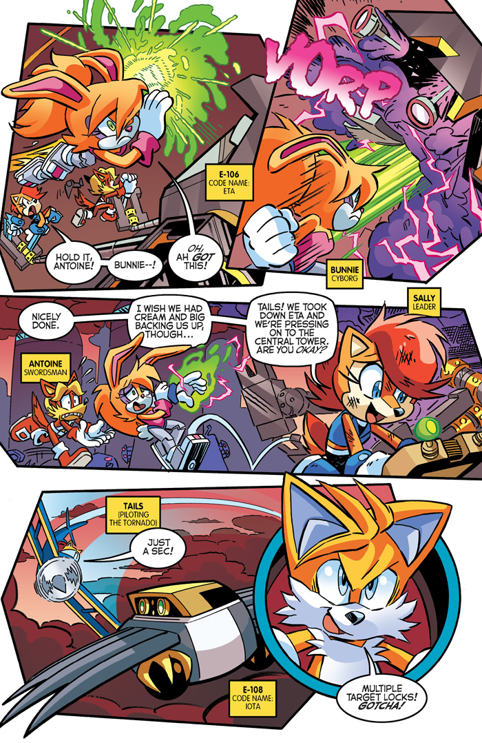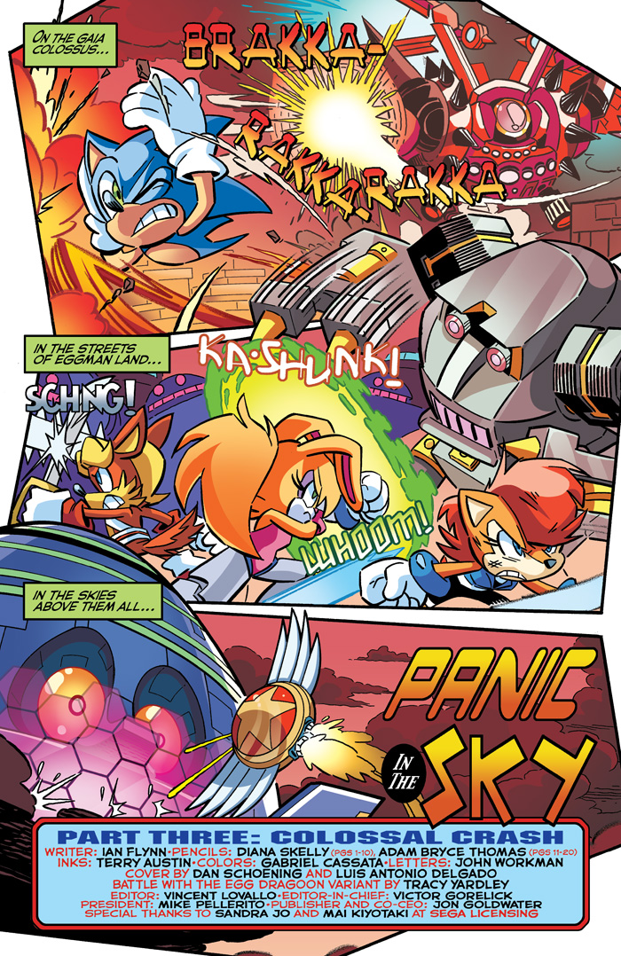 “Panic in the Sky” Part Three: The finale to the “Shattered World Saga” is reaching a fevered pitch!  Sonic battles Dr. Eggman in a desperate bid to rescue Chip!  The Freedom Fighters invade Eggman’s refinery against impossible odds!  Rotor flies the Sky Patrol into a no-win battle with the Death Egg!  And it only gets more nuts from there! Featuring the third of four connecting covers by comics pro Dan Schoening plus an “Egg Dragoon” variant by Mr. Sonic comics, Tracy Yardley!