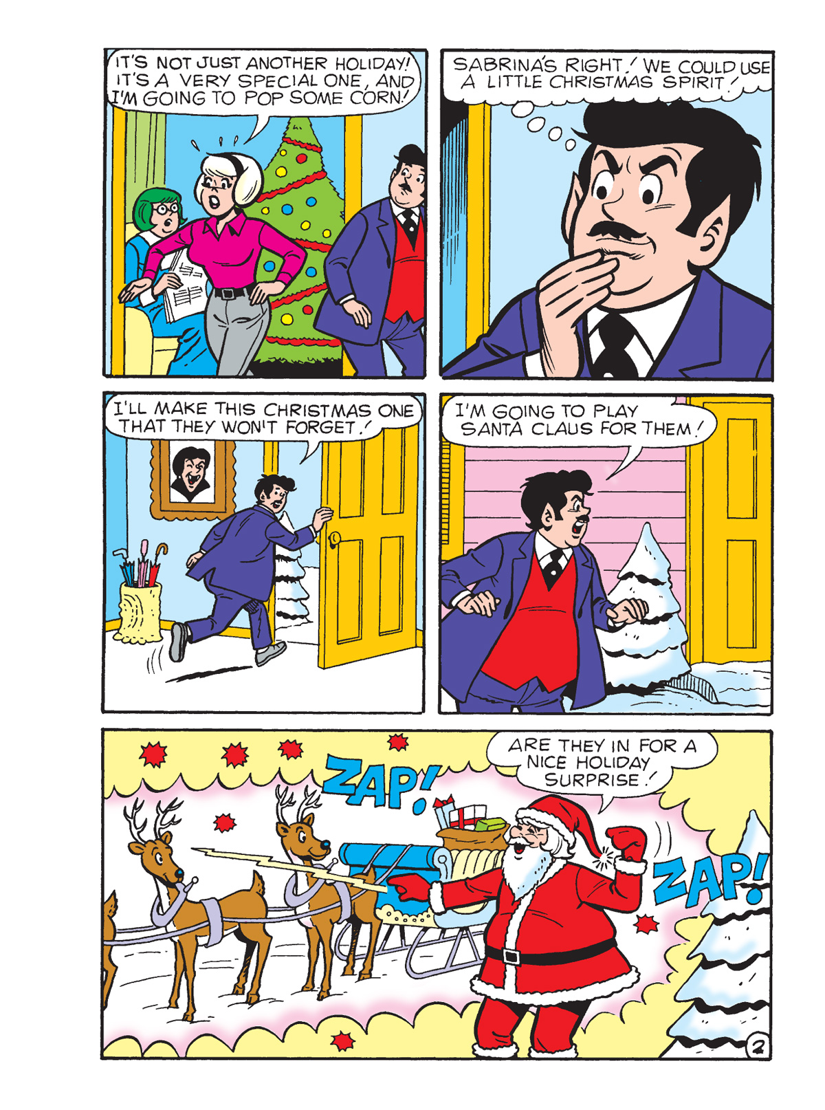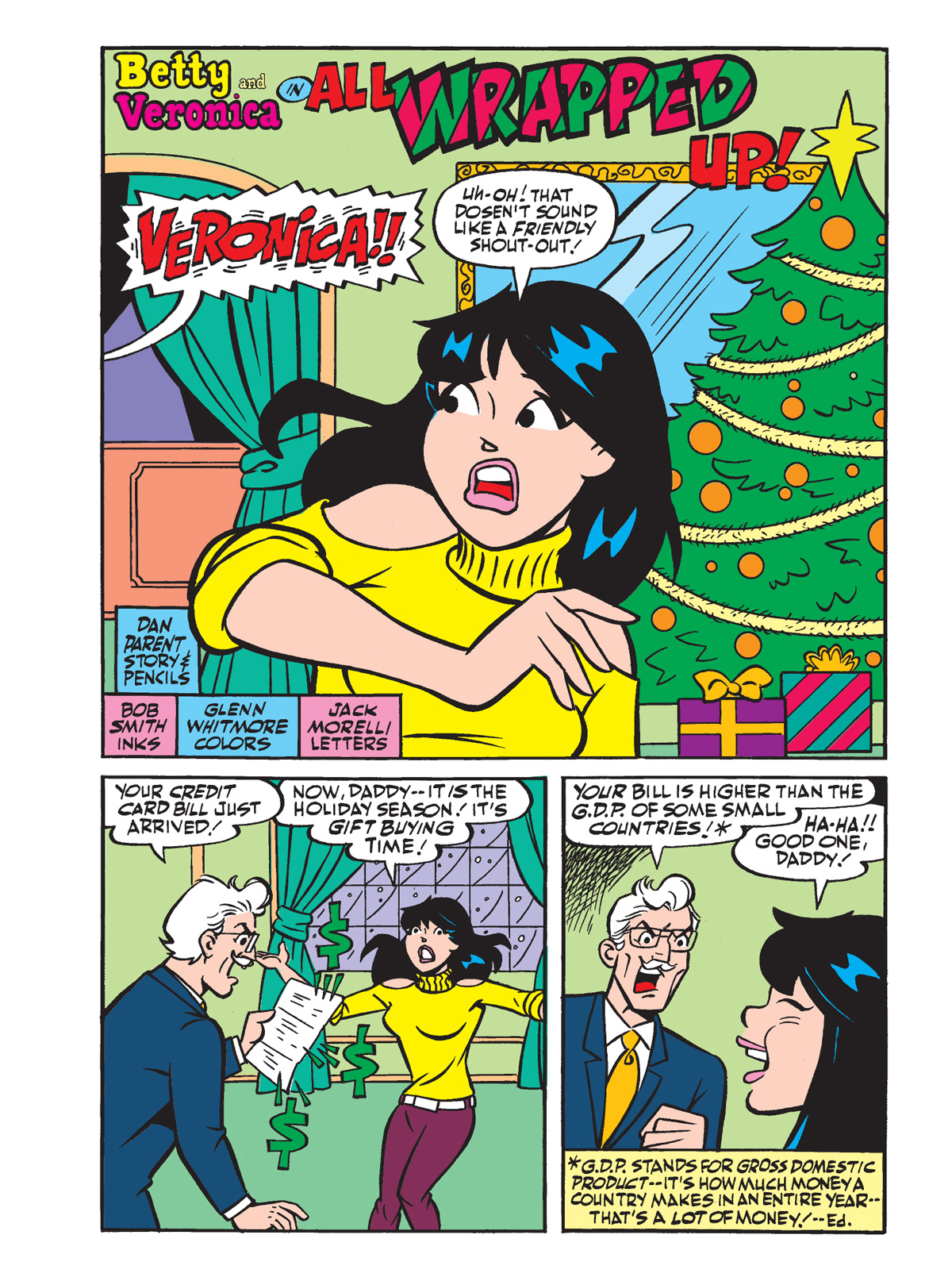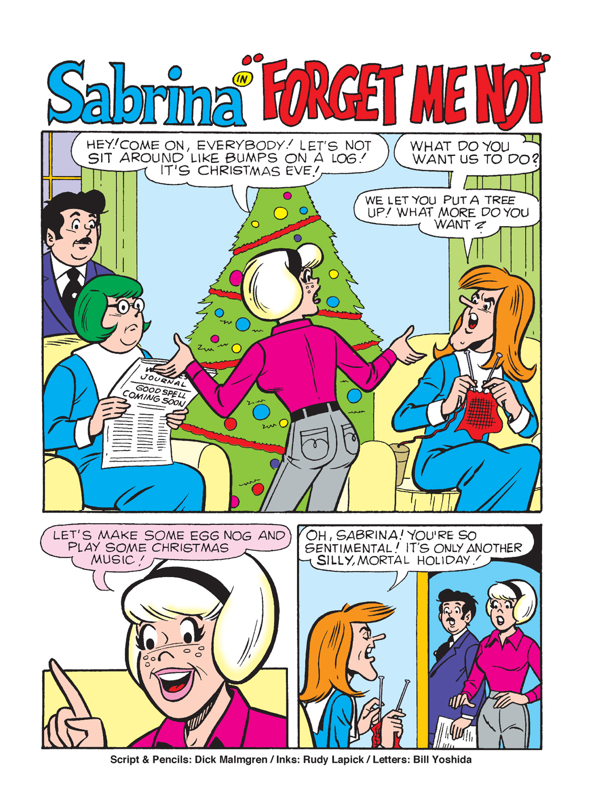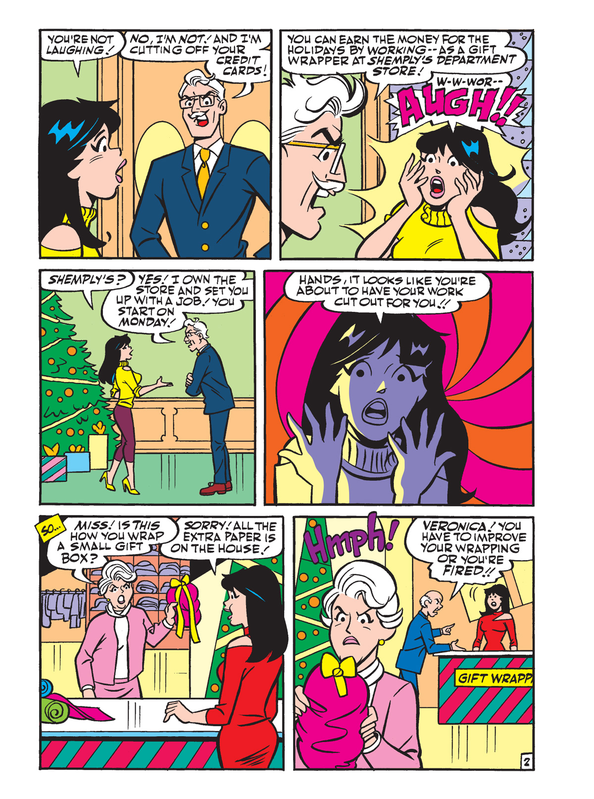 In a brand new Christmas tale by Archie legend Dan Parent, Veronica’s credit cards are maxed so she has to get a job at the mall. This goes about as well as you’d expect! Then, in “Super Sale,” by Ian Flynn and Ryan Jampole, B&V are shopping with Kelly Brand, a.k.a. Fly Girl, when disaster strikes and Kelly flies into action! (And she may get some help from two other super-teens by the end!) After that, we’ve got nearly 200 pages of classic Archie comics with a festive holiday flavor. You can start reading now with a delightful Sabrina story by Dick Malmgren below, and then grab your own copy here. And have a joyous, comics-filled holiday weekend!
