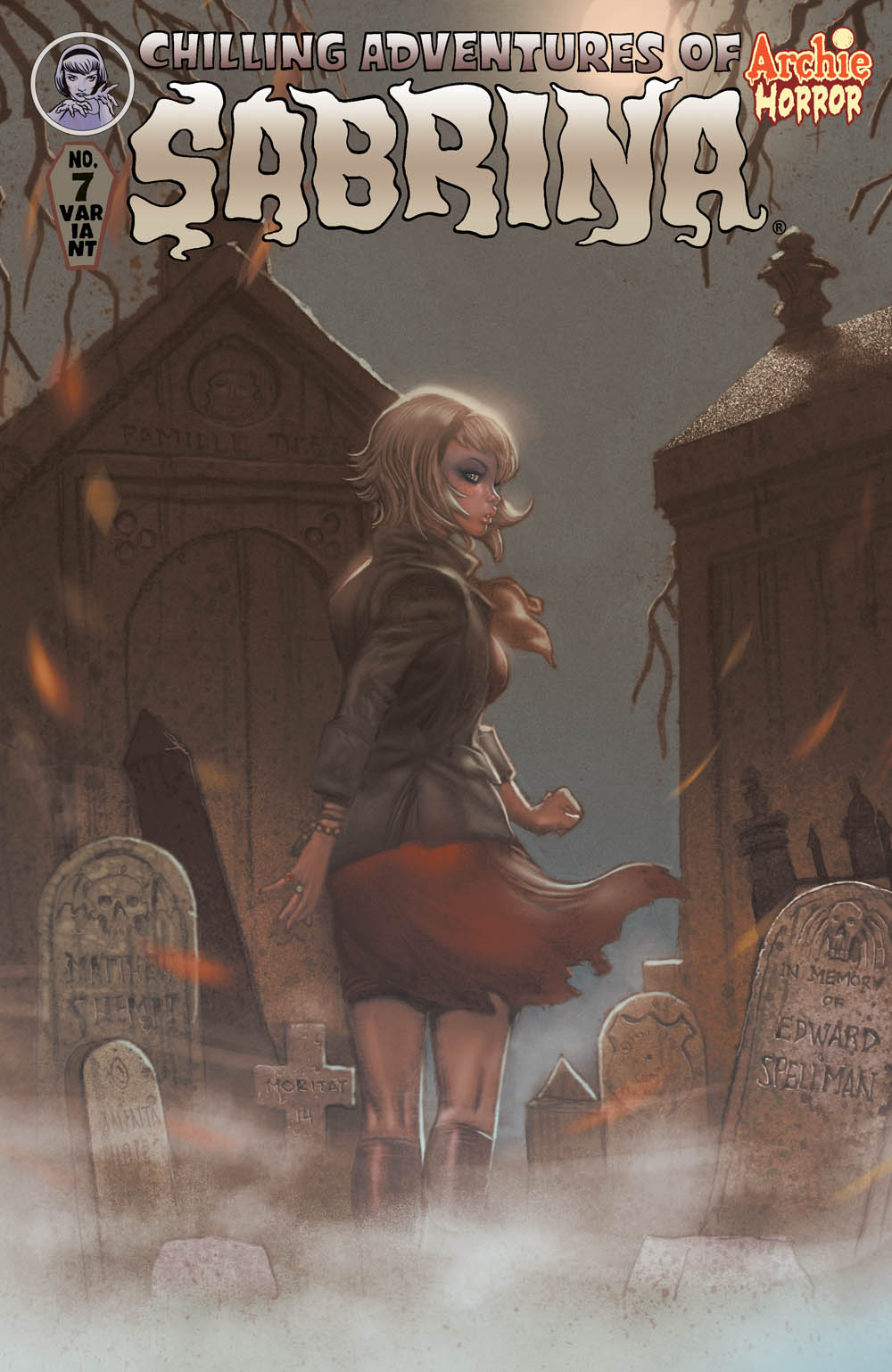 “WITCH-WAR” Part One (of Six): “The Revenants”: Sabrina’s father, Edward Spellman, is back from the dead, inhabiting the body of the newly resurrected Harvey Kinkle! Sabrina, believing the love of her high school life is back, arranges for a romantic rendezvous—but neither Hilda nor Zelda want that reunion to take place and are willing to start a witch-war to keep them apart! Meanwhile, the diabolical Madam Satan reveals her true plans for the Spellman family… You dare not miss the last page of this masterpiece of the macabre!