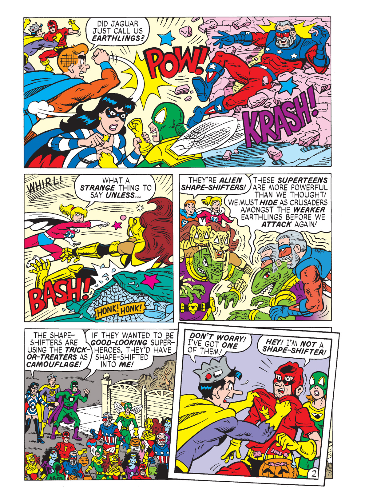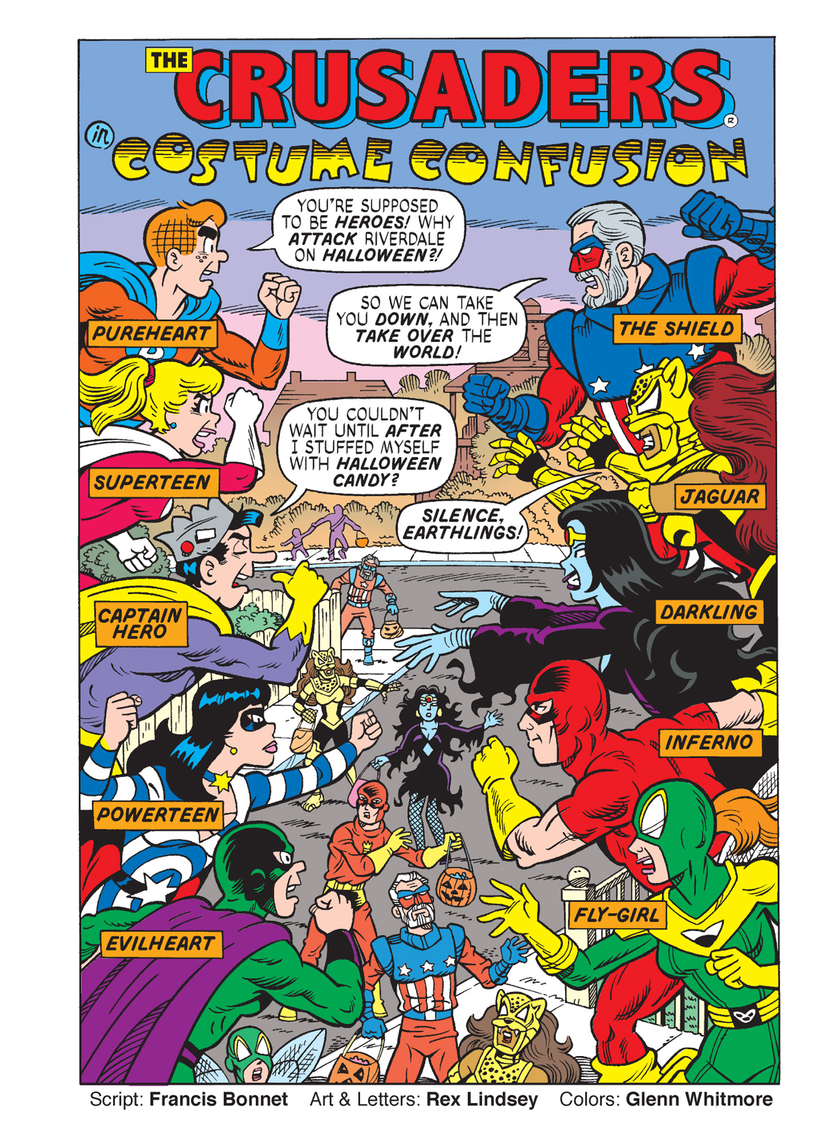 When aliens descend on Riverdale during the spookiest night of the year, Riverdale’s premiere super-team, The Mighty Crusaders, are on-hand to sort it out. But we also have Riverdale’s not-so-premiere super-team, the SuperTeens, involved. Can they work together to save Halloween? You’ll find out in “Costume Confusion” by Francis Bonnett and Rex Lindsey!