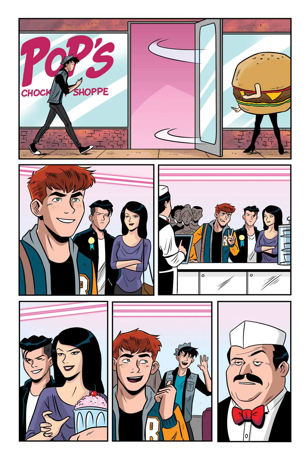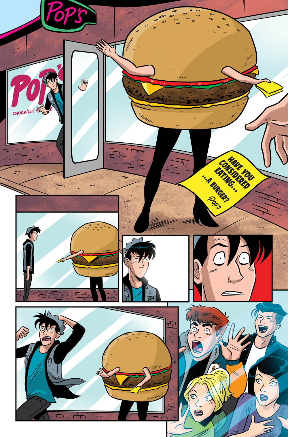 Pop Tate’s has a new mascot: it’s a lady in a burger costume with a giant burger for a head! And she never takes off that giant burger head! And she and Jughead really hit it off, probably for that very reason! But is it possible Burger Lady is MORE than she appears? Find out what happens when Jughead meets a burger he REALLY likes—and a POWERFUL and unexpected new force in Riverdale is revealed!