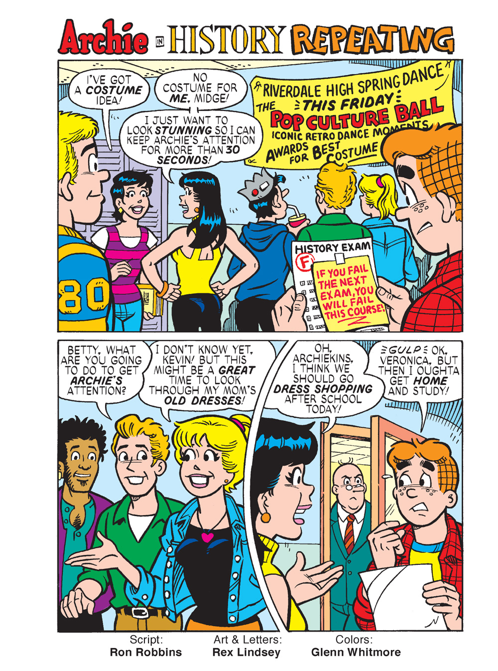 TWO NEW CLASSIC-STYLE STORIES! First, in “History Repeating” it’s time for the annual Riverdale Spring Dance and everyone’s getting into the spirit of the season—aka stressing out big time for the dance! Betty & Veronica discover they’ve bought the same exact dress thanks to the influence of Cheryl Blossom! Kevin’s trying to make sure Cheryl doesn’t ruin the entire engagement and Jughead is . . . well, being Jughead. While everyone’s spring fling is turning into a spring disaster, can Archie swoop in to save the day?