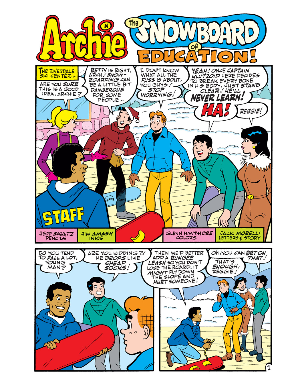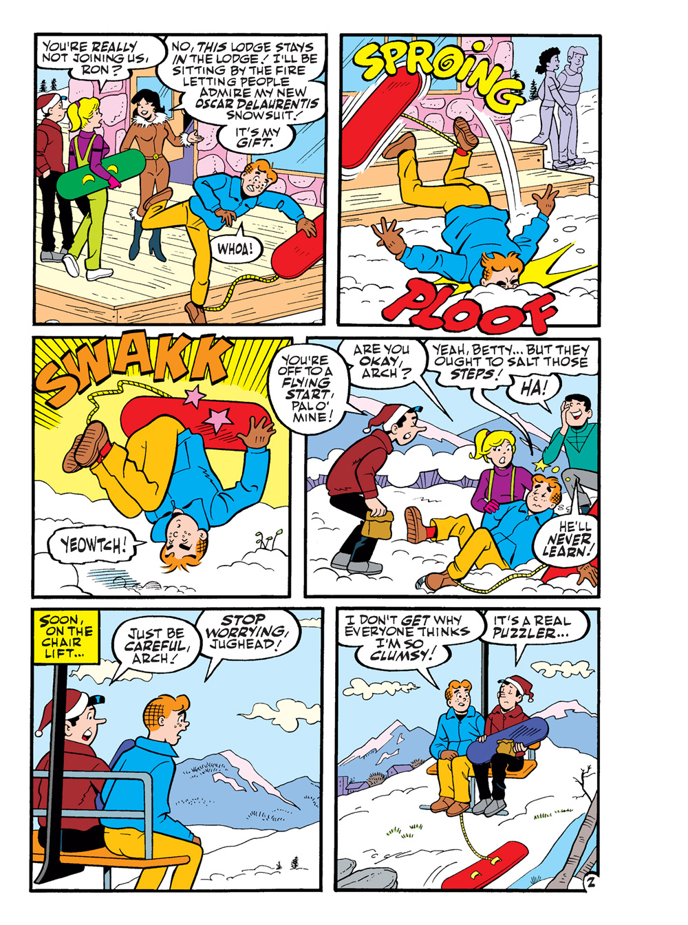 NEW CLASSIC-STYLE STORY: “The Snowboard of Education!” When Archie suggests a snowboarding sojourn, the gang forewarns of the predestined pratfalls that obviously await. Undeterred, our maladroit mainstay forges ahead and learns (or not) an important lesson when more than the slope goes downhill fast!
